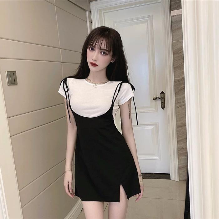 One Set Crew Neck Top + Strap Loose Adjustable Pendek Skirt 1394 (S-XL)