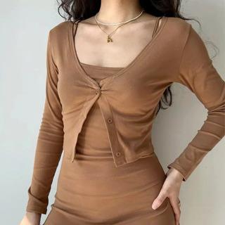 One Set Strap Short Dress + V Neck Long Sleeve Cardigan 1701 (S/M/L/XL)