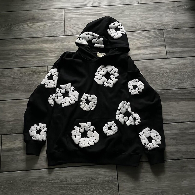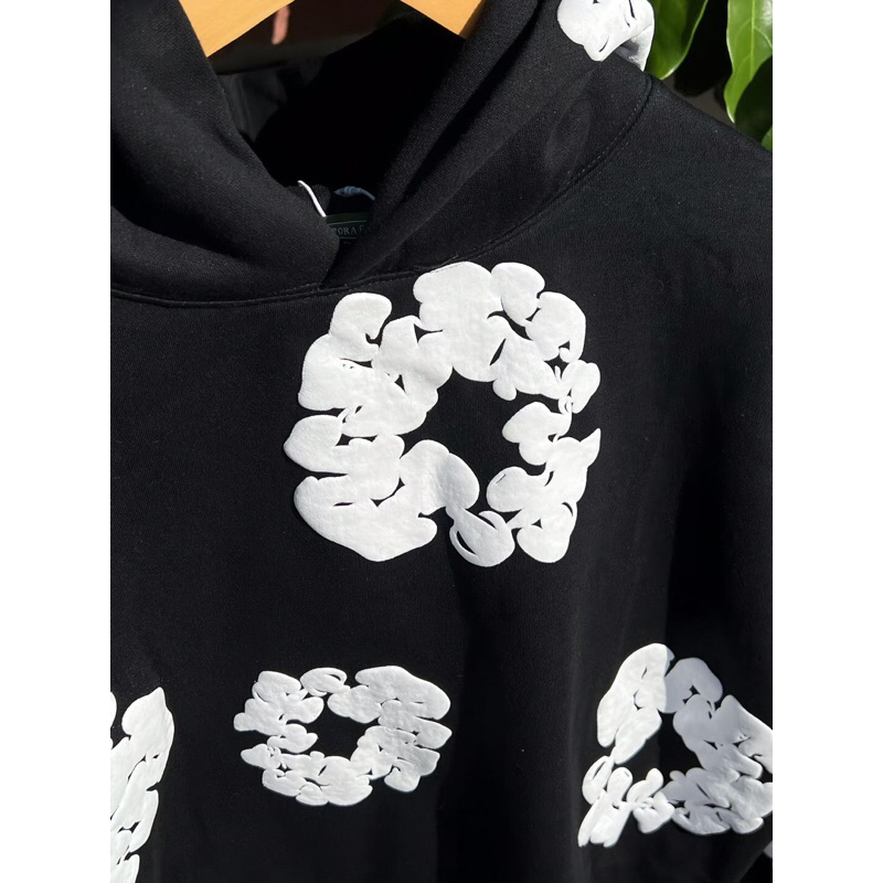 Hoodie Denim Motif Bunga Hitam Cotton Wreats Sweater Hip Hop Puff Foam Flower White Pull Over