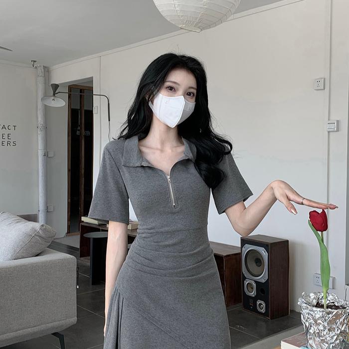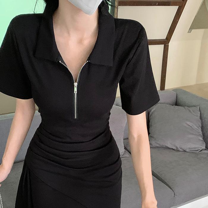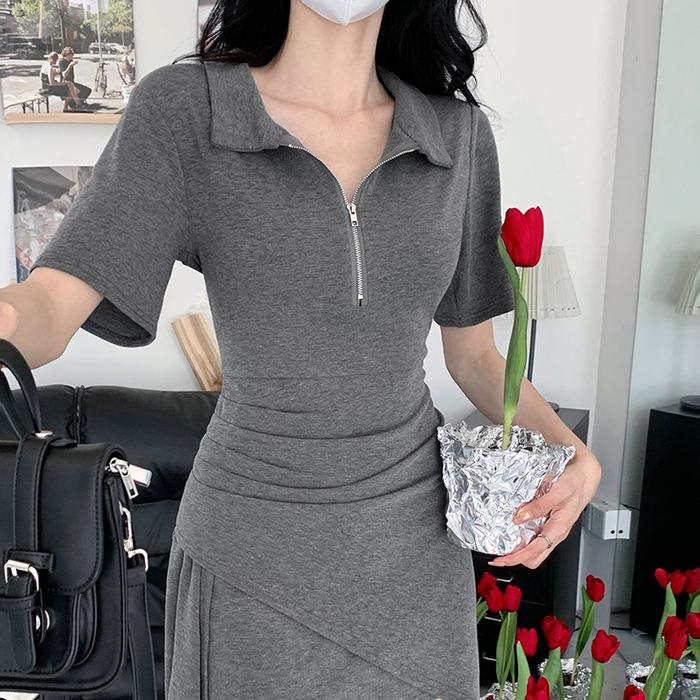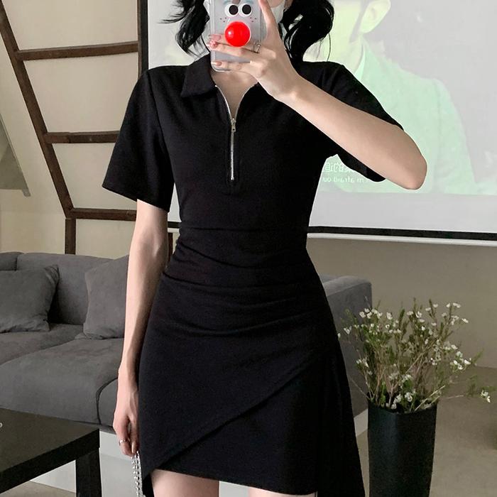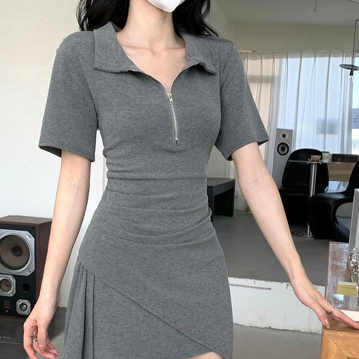 【Premium】Short Sleeve Zipper up Ruched Short Dress With Side Split 2673 ( S/M/L/XL)