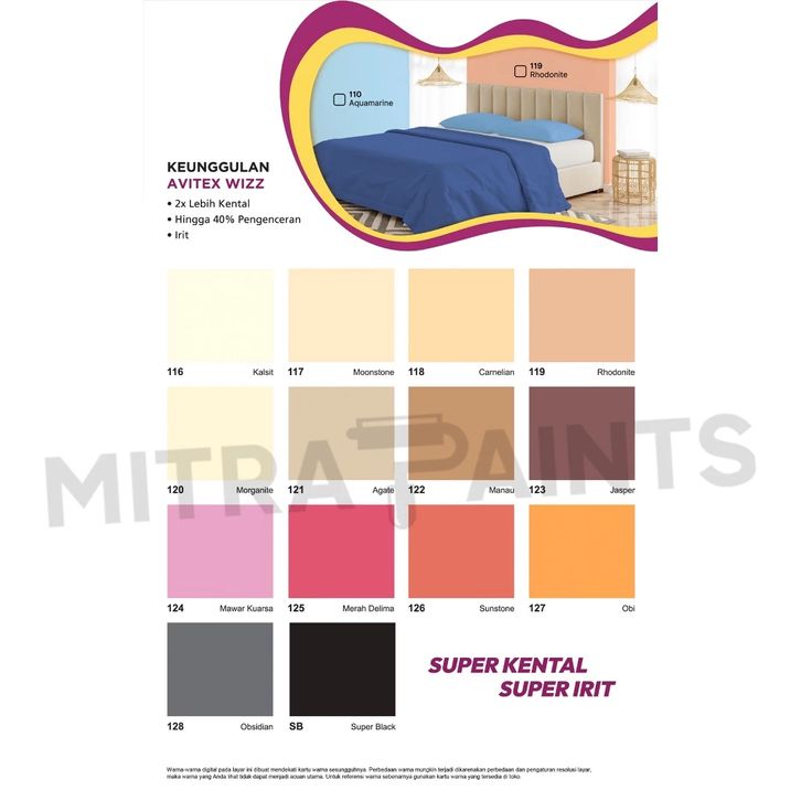 SUPER WHITE, PUTIH, BRILLIANT WHITE, 101 SODALITE, 102 AMBER, 103 CITRINE, 104 SUNGAI DAREH, 105 BACAN, 106 GIOK, 107 ZAMRUD, 108 PERIDOT, 109 PIRUS, 110 AQUAMARINE, 111 SAFIR, 112 KALIMAYA, 113 KYANITE, 114 SMOKY QUARTZ, 115 ANDESIT, 116 KALSIT, 117 MOONSTONE, 118 CARNELIAN, 119 RHODONITE, 120 MORGANITE, 121 AGATE, 122 MANAU, 123 JASPER, 124 MAWAR KUARSA, 125 MERAH DELIMA, 126 SUNSTONE, 127 OBI, 128 OBSIDIAN, SUPER BLACK, BAMBOO HOUSE, QUIET VILLAGE, HIGH TEA, VANILLA SKIES, TORRENTS 1758, COOL BREEZE, ROCK POOL, INTO THE BLUE B5, BESPOKE SHOES, LAST DREAM, WHITE OAKWOOD, LAST KISS O1, BRIGHT NECTAR 306, DAYDREAMER GREEN, ARTIC SILVER 670, RETICENT WHITE NP, ROCK OYSTER, MOCHA HILL, MEMORIES 1517