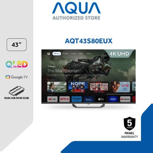 AQUA SMART TV 43 Inch AQT43S80EUX 4K HDR Google TV Bezel Less RAM 2GB ROM 32GB Digital TV YouTube Netflix Packing Kayu