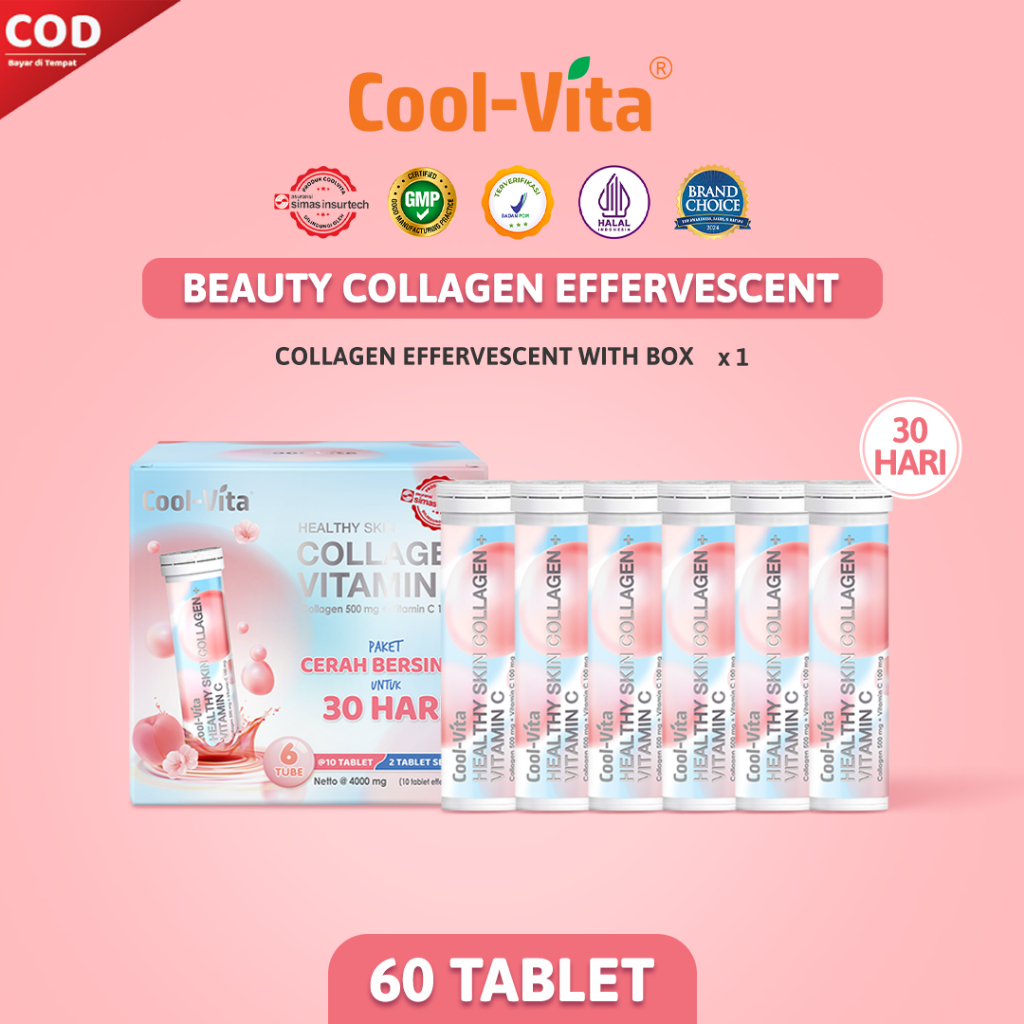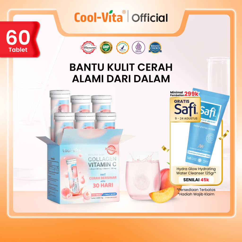 Coolvita Paket Glowing 30 Hari (6 Tube - 60 Tablet) Collagen Effervescent - Tablet Larut Rasa Peach | Bantu Kulit Cerah dan Awet Muda - BPOM & Original