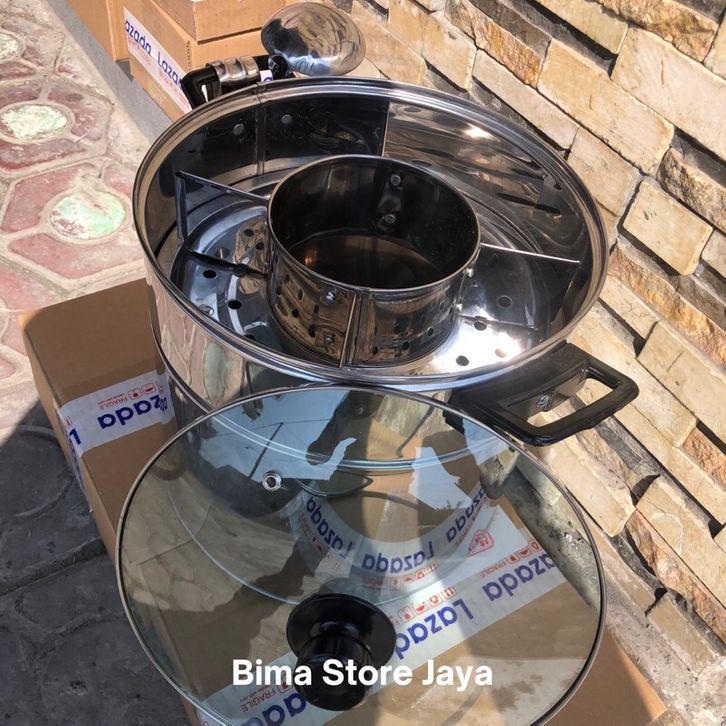 DANDANG BAKSO STAINLES TUTUP KACA 24cm SEKAT 4 PEGANGAN ANTI PANAS LENGKAP ADA CENTONG CAPITNYA