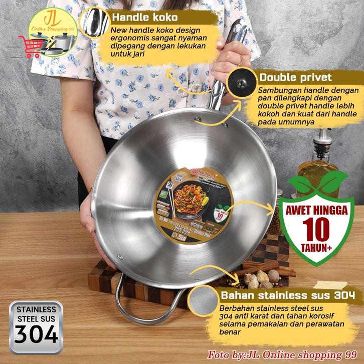 SUPRA New panci Stir wok 28cm + + steamer + tutup kaca kombinasi viliron stainless SUS 304 professional impact series