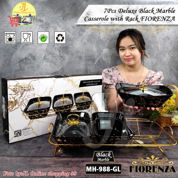 FIORENZA 7pcs prasmanan set segi + tutup + rak motif Black marble deluxe series keramik MH-988GL