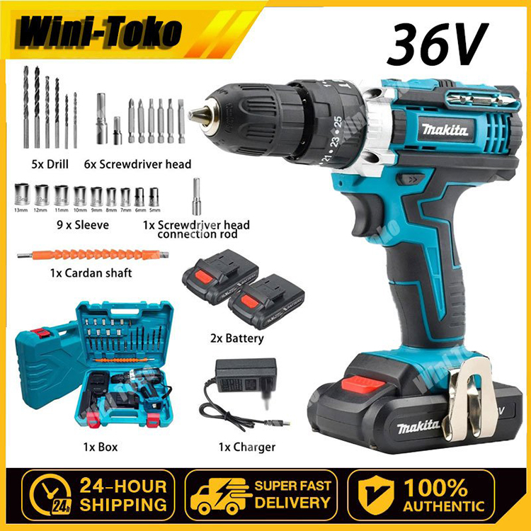 Makita 36V Bor Cordless Impact Drill 2x Baterai Alat Listrik Set Sekrup Tanpa Kabel