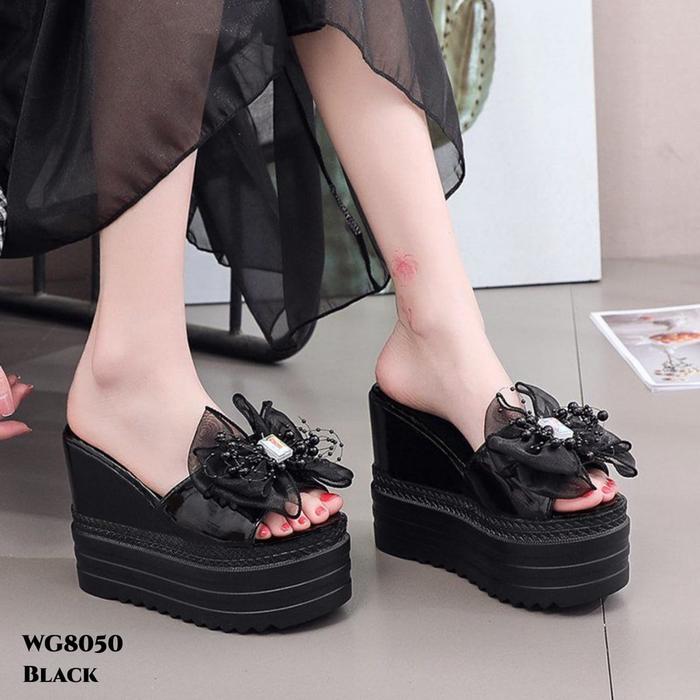 Sandal Wedges Wanita Ribbon Highsole Diamond & Pearl Ala Korea Style Shoes Wg8050 - Black, 36