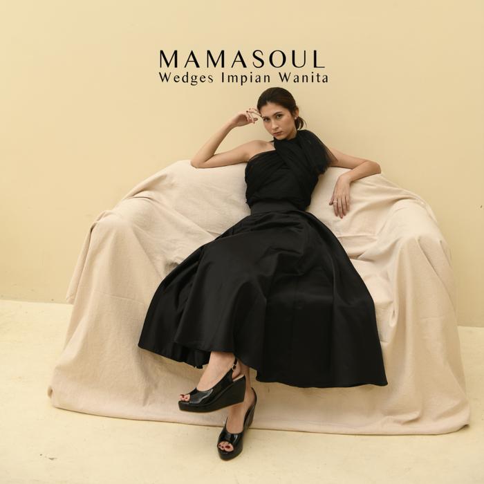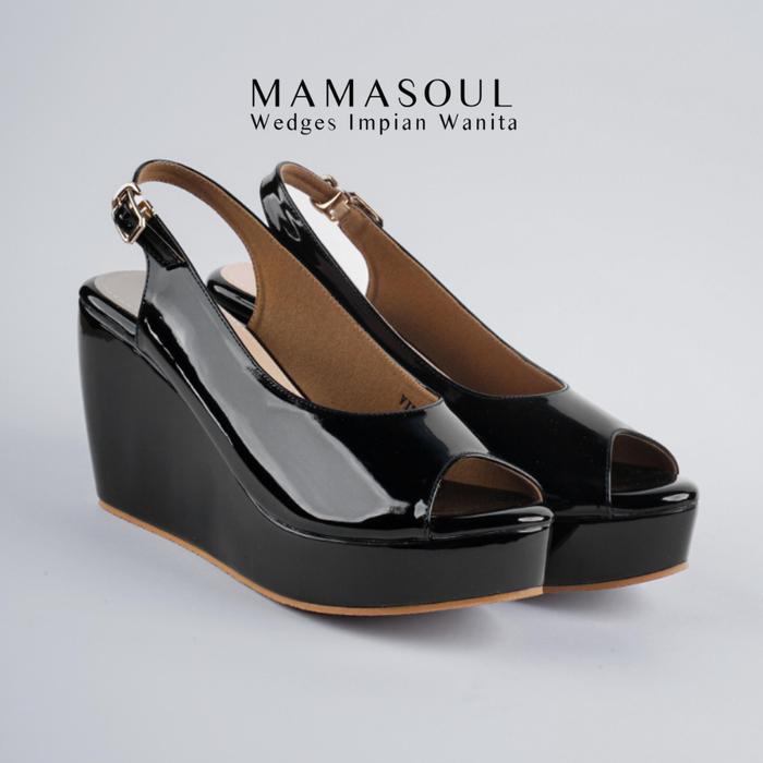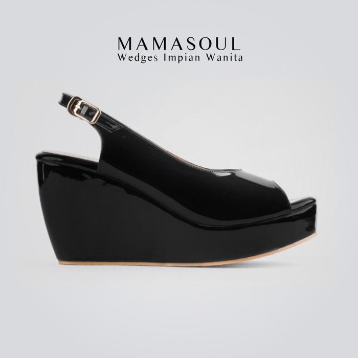 Mamasoul Wedges Vienna - Wedges Sepatu Sandal Wanita Terbaru Tali Glossy 9Cm Black Sendal - Patent Black, 35