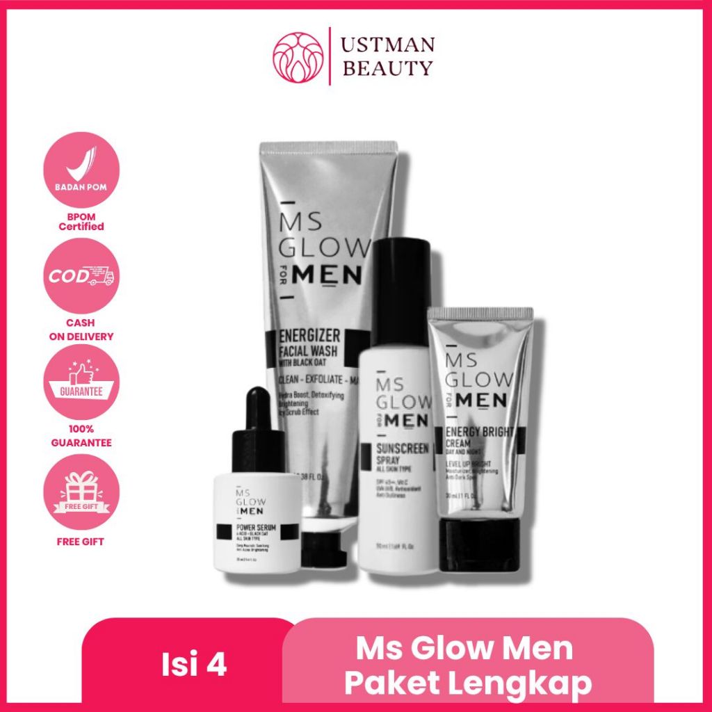 Ms Glow Men Paket Basic Krim Pemutih Wajah Pria Serum Penghilang Jerawat Bekasnya Sunscreen Spray