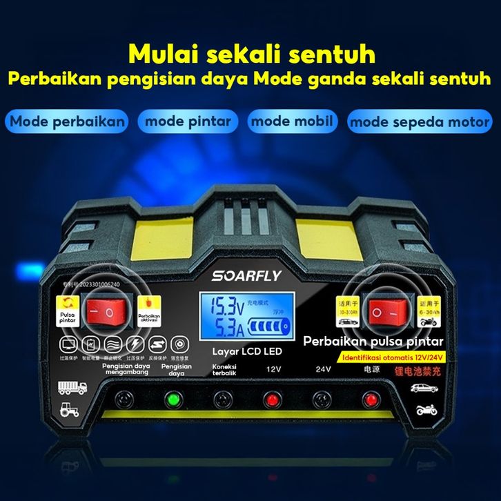 SOARFLY Car Charger Otomatis Aki Mobil Motor Kapal Truk Automatic Fast Smart Charger 12V/24V 220W