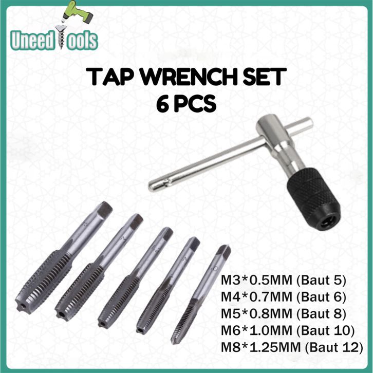 UneedTools Hand Tap set M3-M8 6 PCS plus Gagang Handtap Membua Drat/Hand Tapping Baut M3-M8