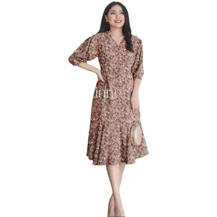 Dress Wolfis Premium Korean Stayl -by D&D- Cantik Bumil Kerah Square Model Puff Karet Kerutan Elastis - MOCCA MAWAR L