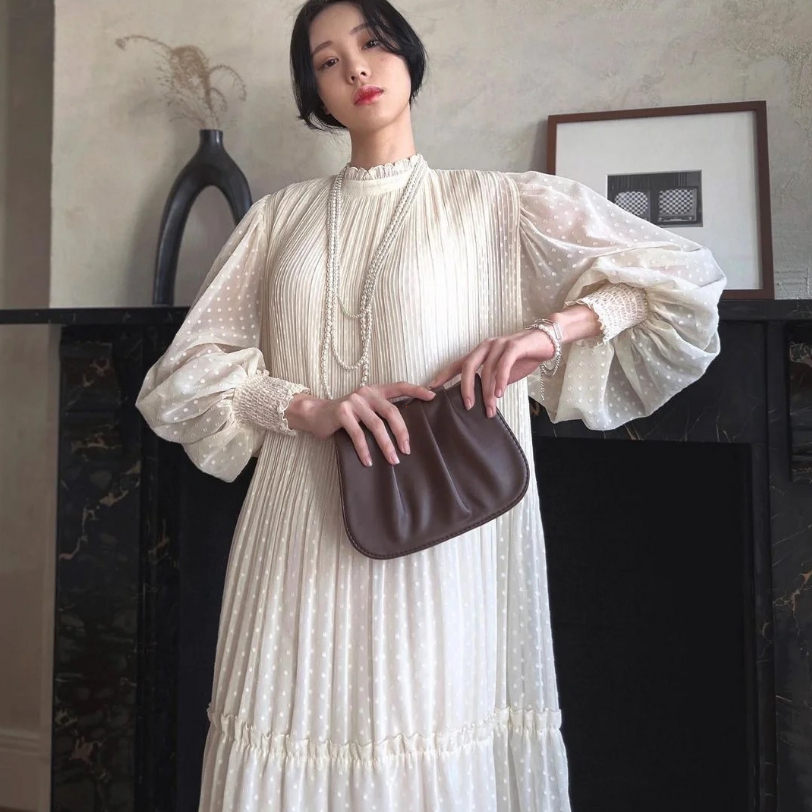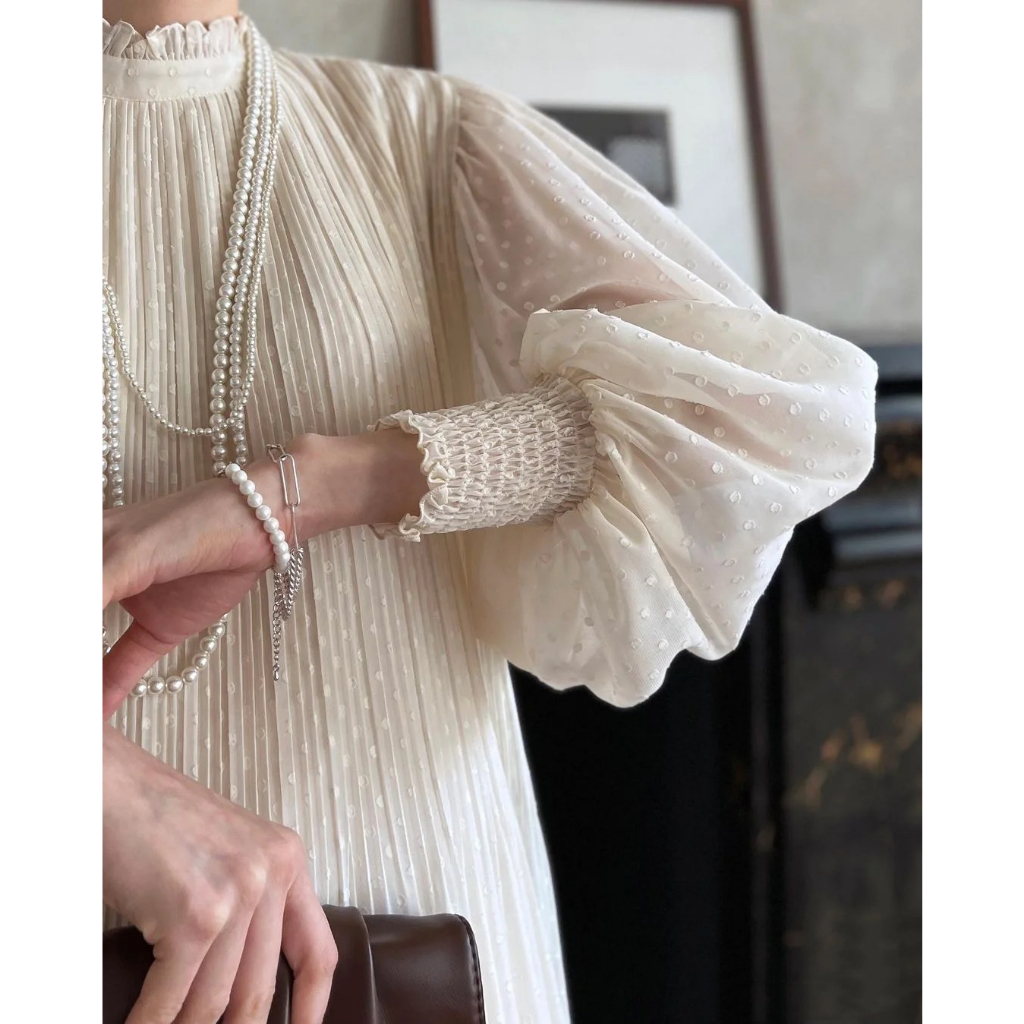 Dress Korean Style Gaun Polka Dot Lengan Lentera Sedikit Berlipat Dres Panjang Princess Kekinian