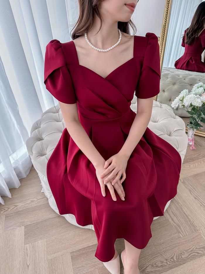 Tullip Dress | (Dress Pesta midi scuba tebal premium) - Maroon S