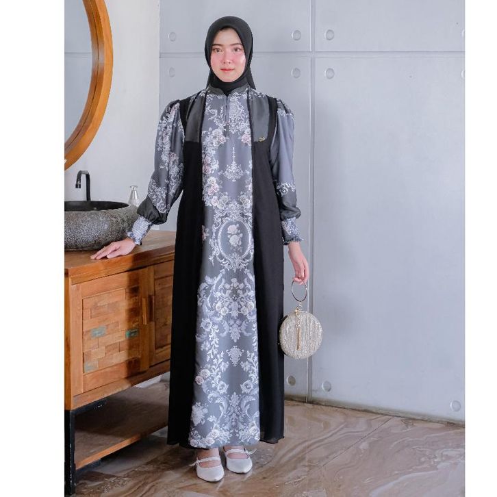 Arnufi - Gamis Ardella Ceruty Combi Silky Resleting Depan Mewah Dan Elegan