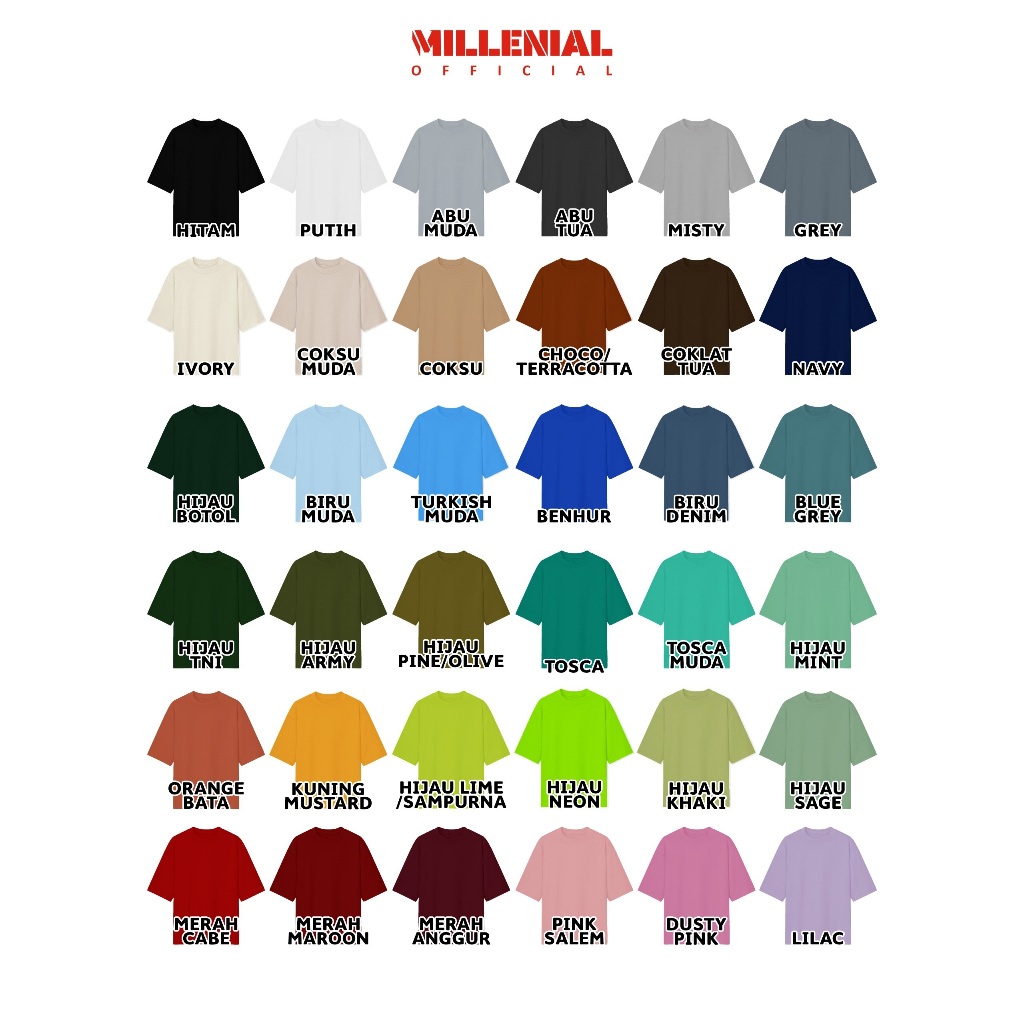 COKSU, CHOCO, HIJAU BOTOL, HIJAU MINT, BIRU DENIM, ABU GREY, HIJAU SABILO, COKLAT TUA, MARON, COKSU MUDA