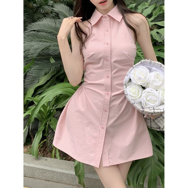 Gaun Kemeja Off-shoulder Halterneck Tanpa Lengan/rok Lipit Kerah Polo Gaya Korea/gaun Kasual BY ORIGINAL PRODUCT