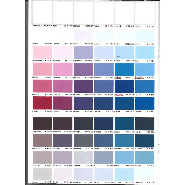 300 White, 1001 Brilliant White , 1050P White Lilac, 1104P Yellow Necklac, 1021P Swanlike, 1073P Green Pass, 1215P Sweet Peach , 1149D Golden Dome, 1310D Crimson Tide , 1681D Spring Vigor, 1800D Terrestrial Gr , 1113A Absolute Yello, 1260A Sashay Red , 1526A Porcelain Blue, 1848A Creamy Caramel , 2111A Faraway, 1350T Vintage Rose , 1535T Cerulean, 1619T Green Gauze , 2045T Smoking Gray, 1831P Almond Chip , 2984P Nitro Gray, 1002P Snow White , 1081P Reserved White, 1011P Soft Tissue , 1049P Special Touch, 2034P Abacadabra, 1883A Saddle Brown, 1876A Sable Brown
