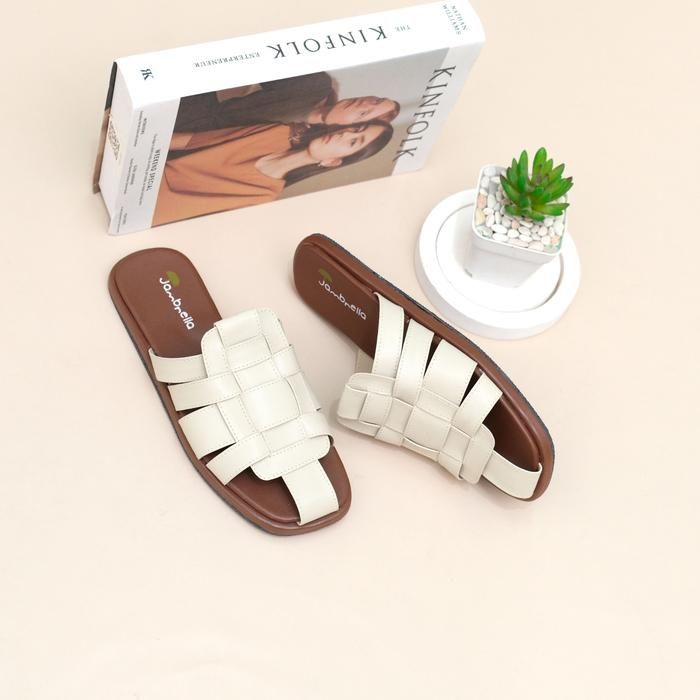 Sandal flat wanita Jambrella SOWON sandal slop wanita baru Sendal Cewek - Cream 36
