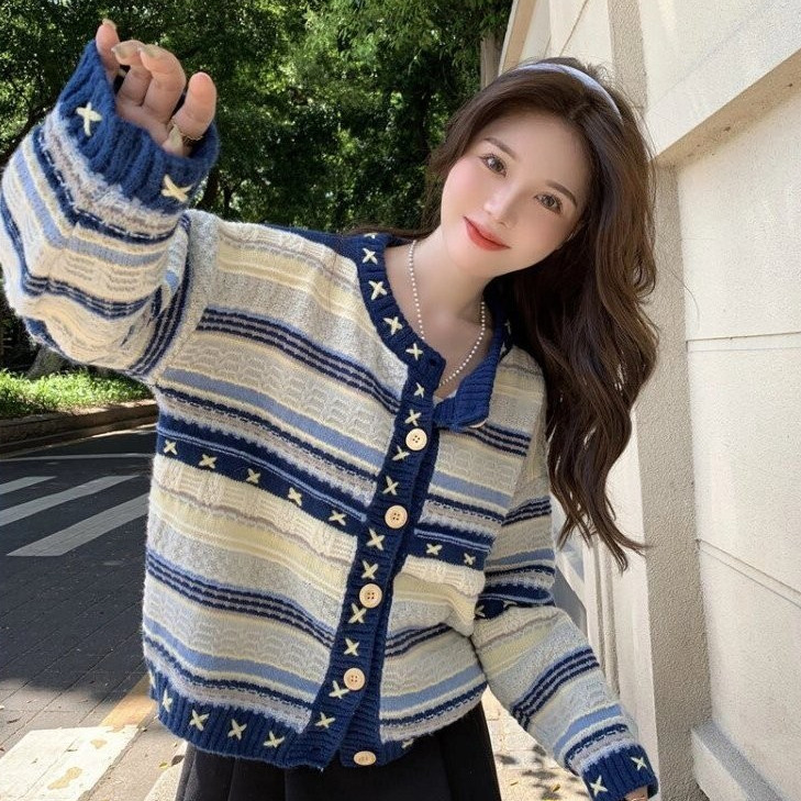 Cardigan Rajut Premium Outer Knit Terbaru Sweater Stripe Wanita Motif Stripe Biru