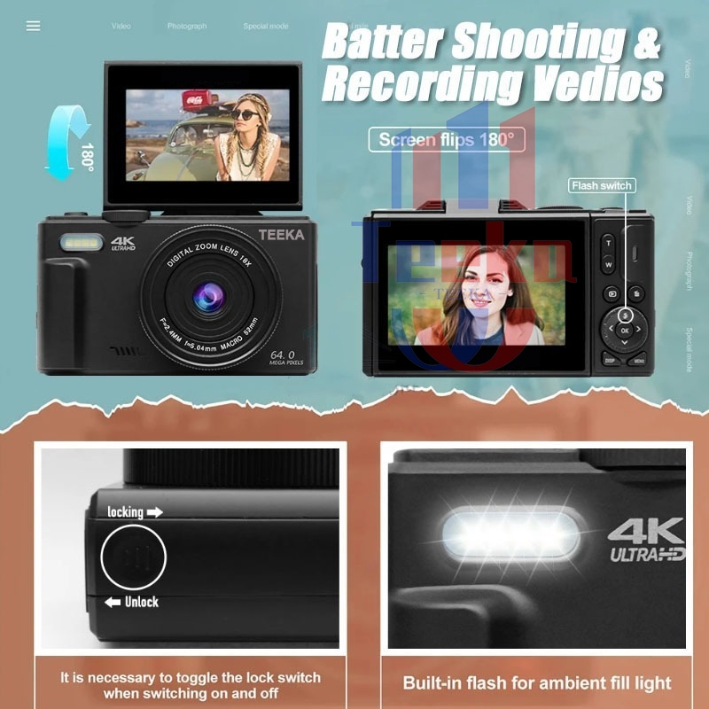 Kamera Digital Wifi Video 4K 18X Digital Zoom Dengan Dukungan Selfie Koneksi WIFI【Dengan Kartu 64GB】TEEKA 64MP