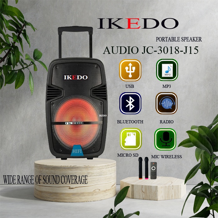 IKEDO Speaker Aktif 15 inch Speaker 2 Mic Bluetooth Portable JC-3018-15 (GRATIS PACKING KAYU)