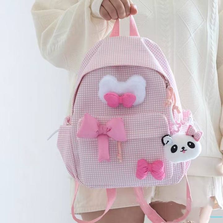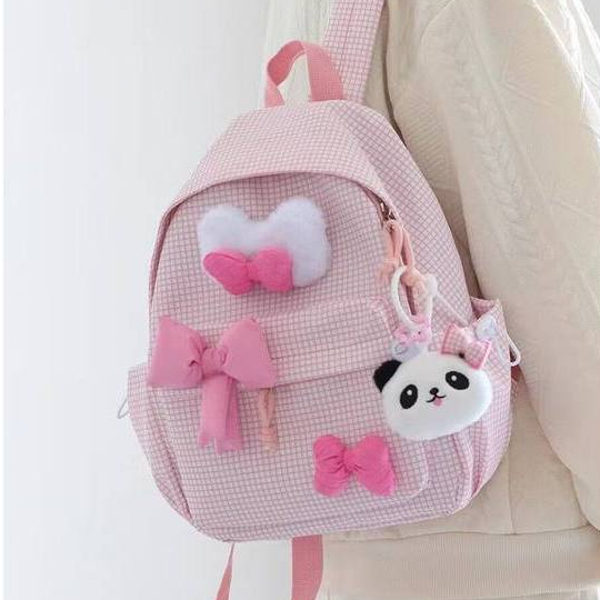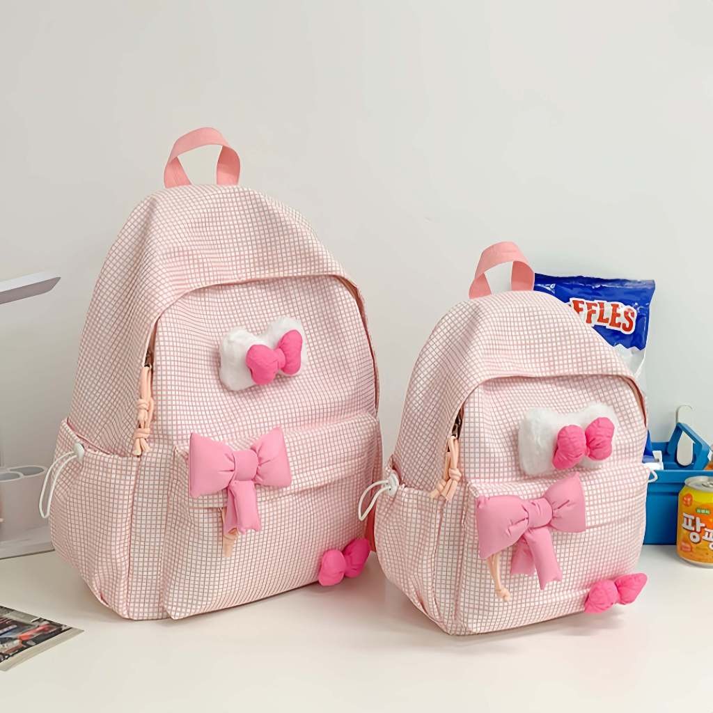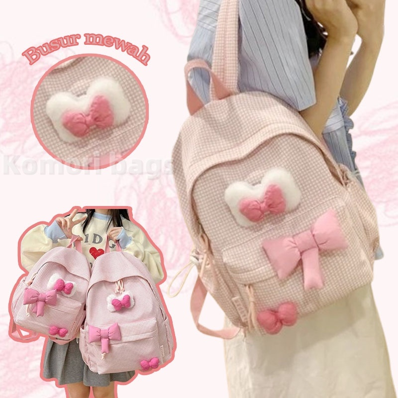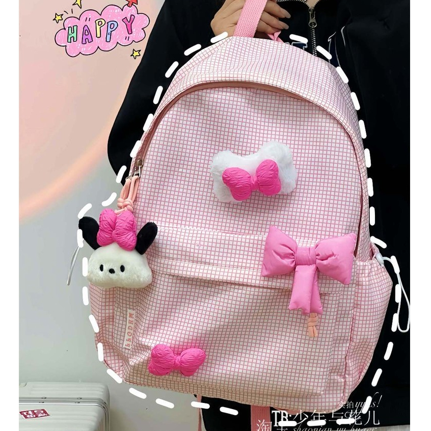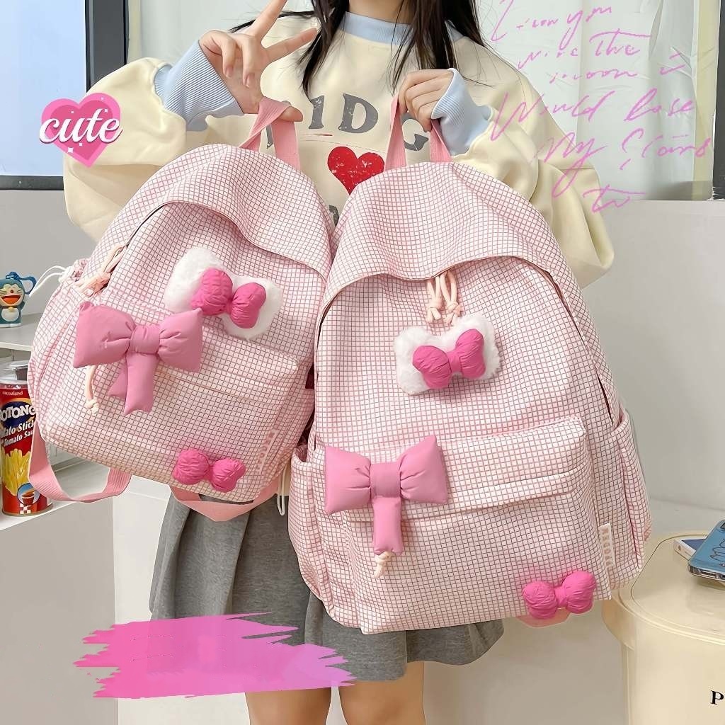 Tas Sekolah Wanita Lucu Pink/Bag Baru Y2K Korea Gadis Hati Tas Ransel Kisi/Kupu-Kupu