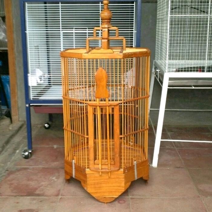Kandang burung segi 8 pernisan kayu jati diameter 37 cm x T 53 cm