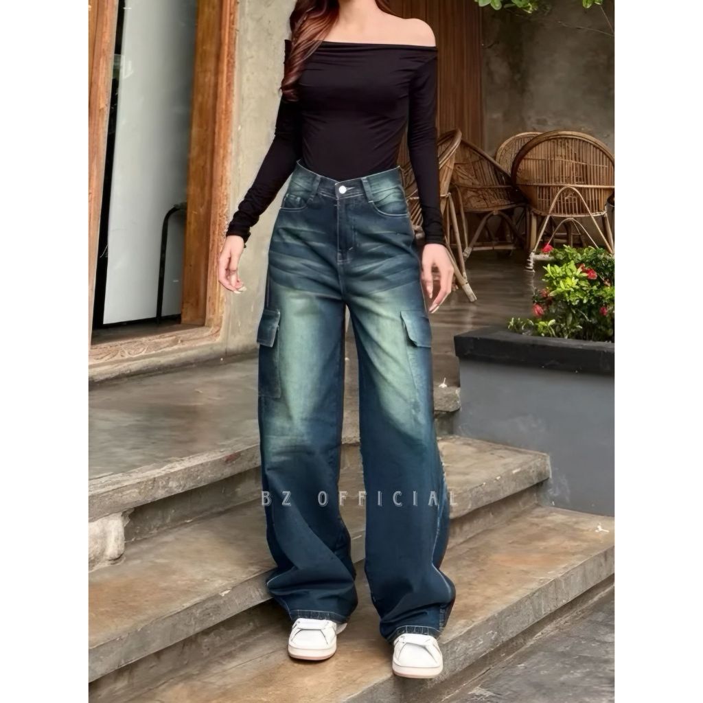 Celana Cargo Whisker Wanita – Jeans Highwaist Baggy Loose Fit Kekinian