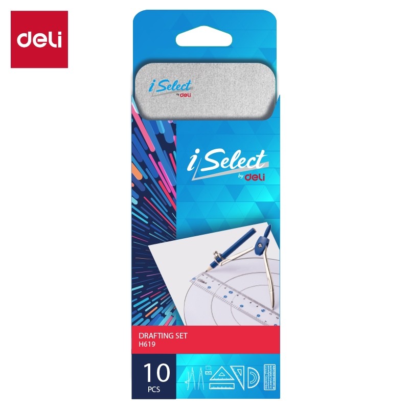 Deli I-Select Jangka Set Penggaris Sekolah Isi 10 pcs Gratis Penghapus Drafting Set Box Metal H619
