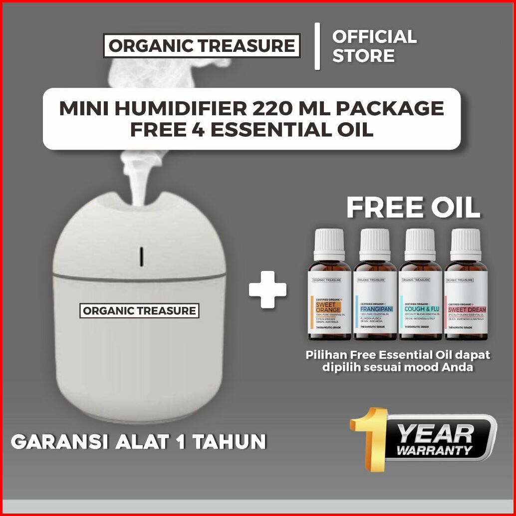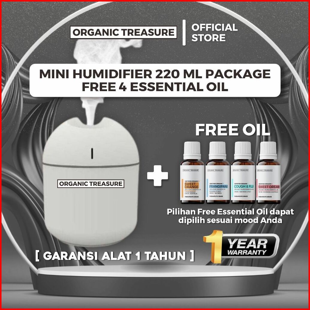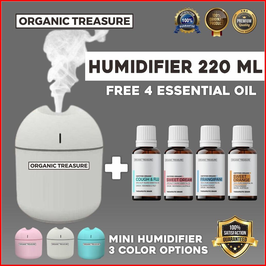Organic Treasure - Paket Mini Humidifier 220ml Aromatherapy Free 4 Essential Oil Grade 1 Year Guarantee