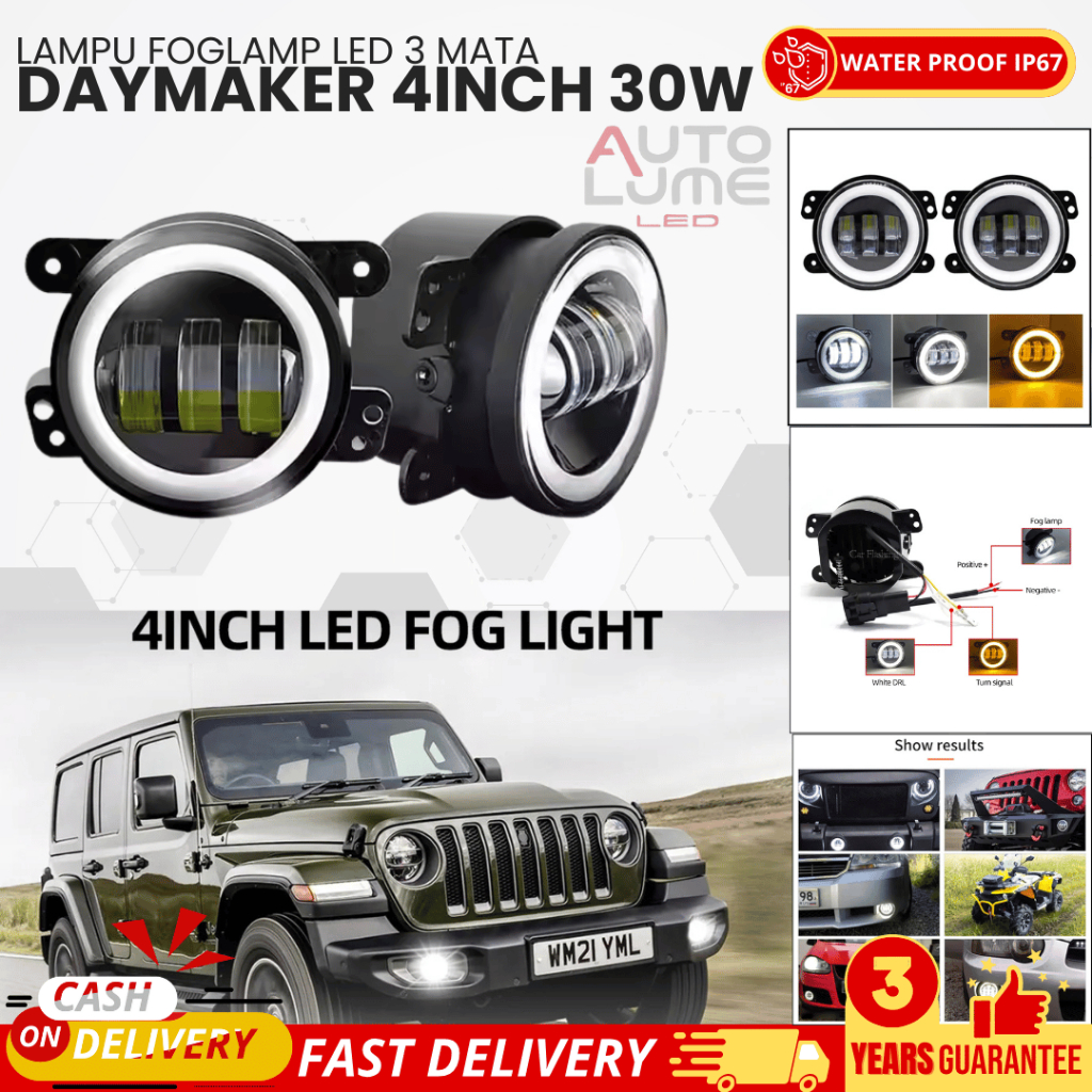 【AutoLume】SEPASANG Lampu Foglamp LED 4 Inch | 3 Lensa Full Ring | 2 Warna (Putih & Kuning) | 60W | Cocok untuk Off-Road, Motor, Mobil& Jeep Wrangler