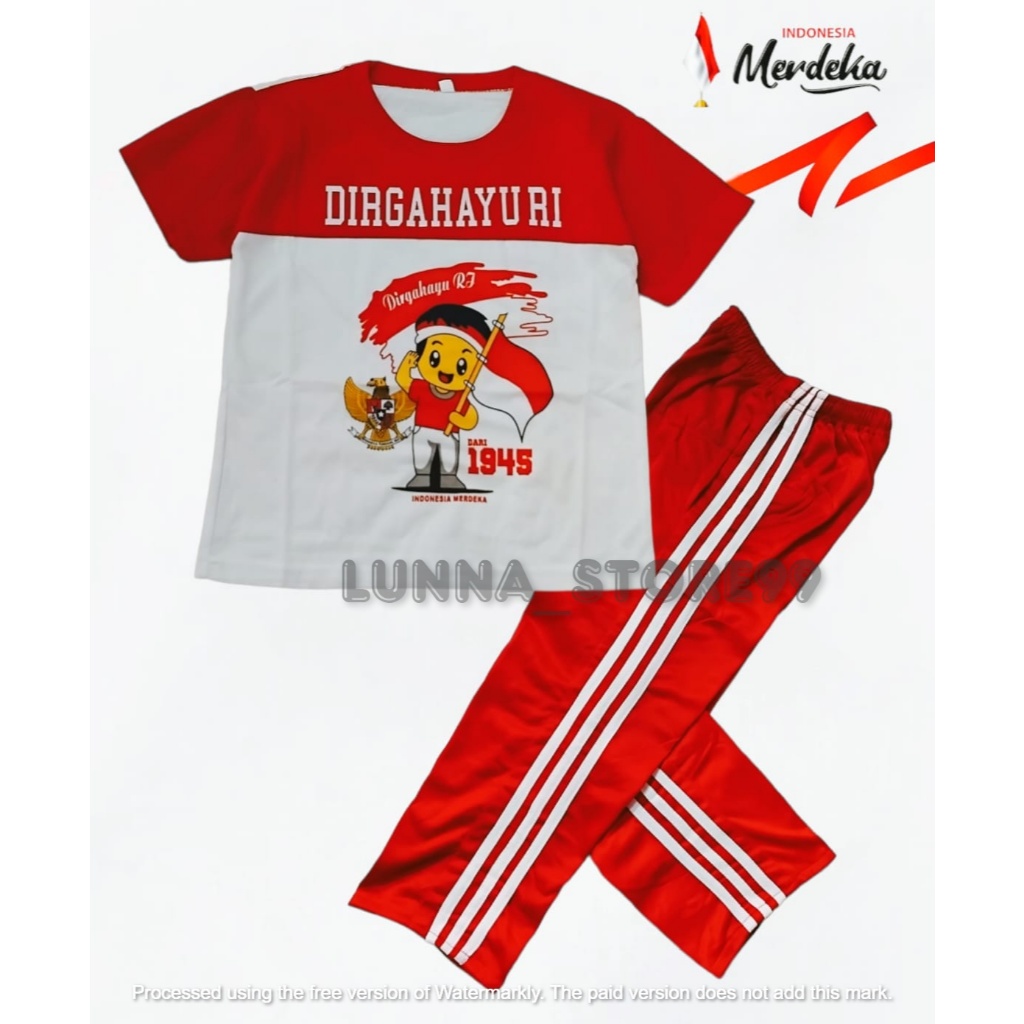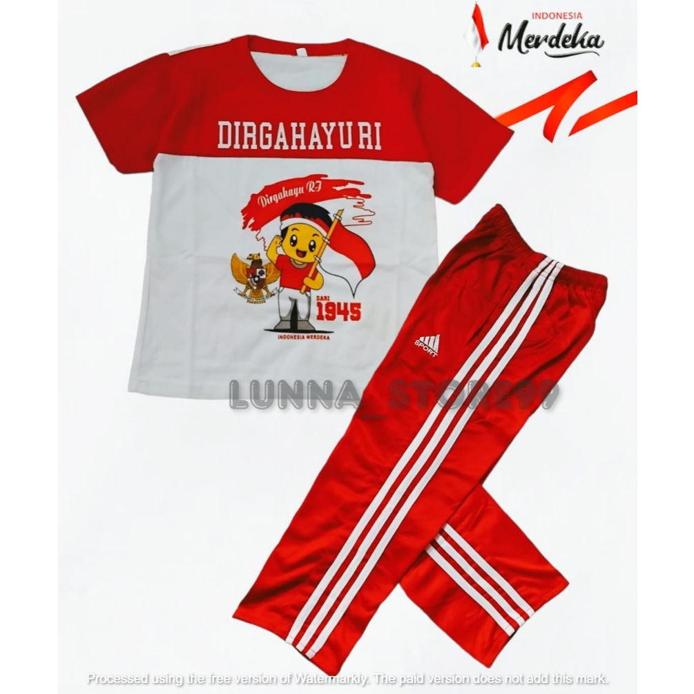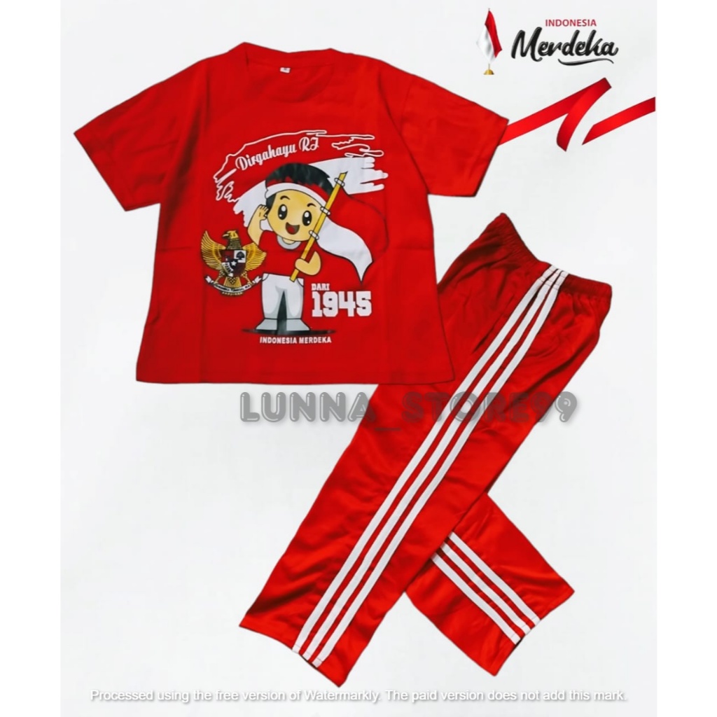 Setelan Anak Baju Kaos Merah Putih Lengan Pendek + Celana Training Merah Buat Usia Anak 6 Tahun Sampai 12 Tahun Bahan Katun
