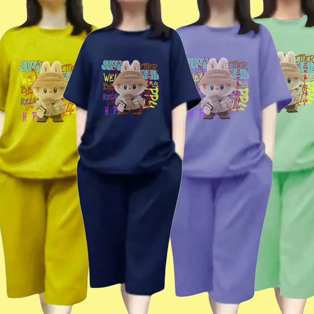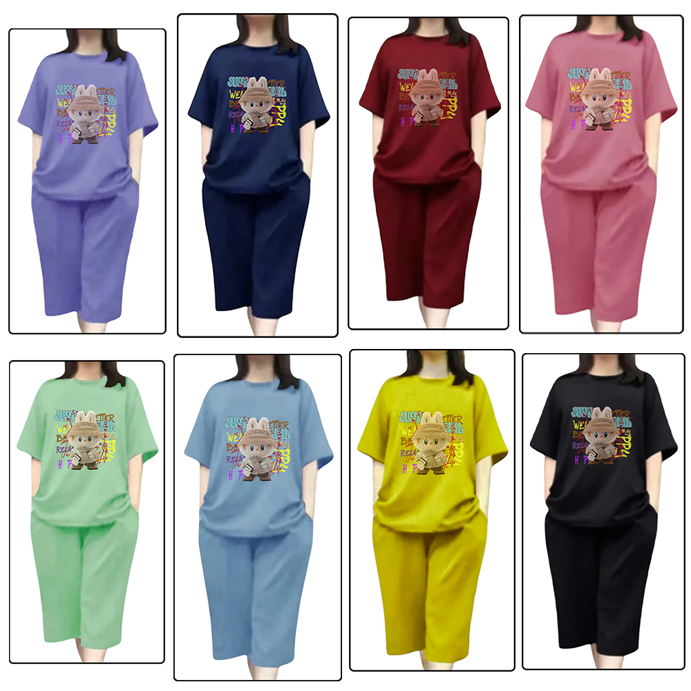 Charyatink - LABUBU BEIGE Setelan celana kulot 3/4 Baju dewasa wanita Bahan Katun Babyterry