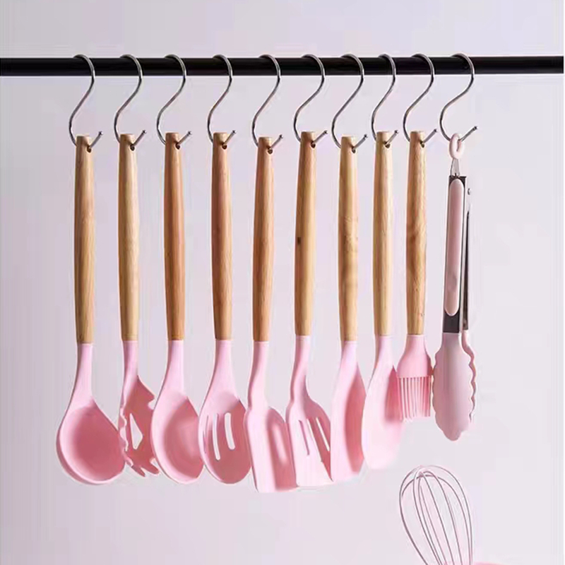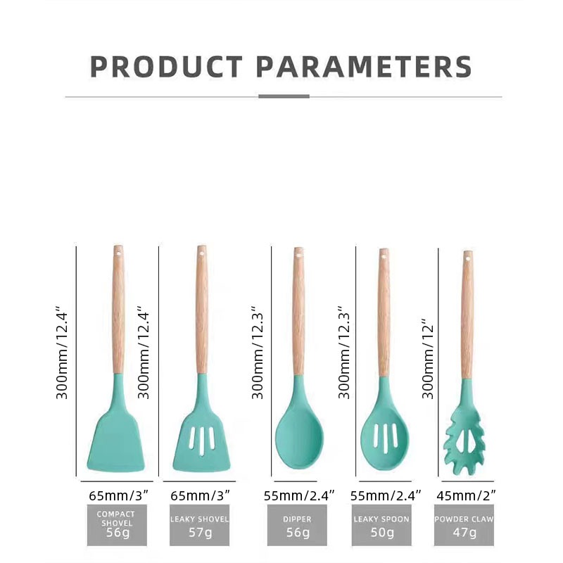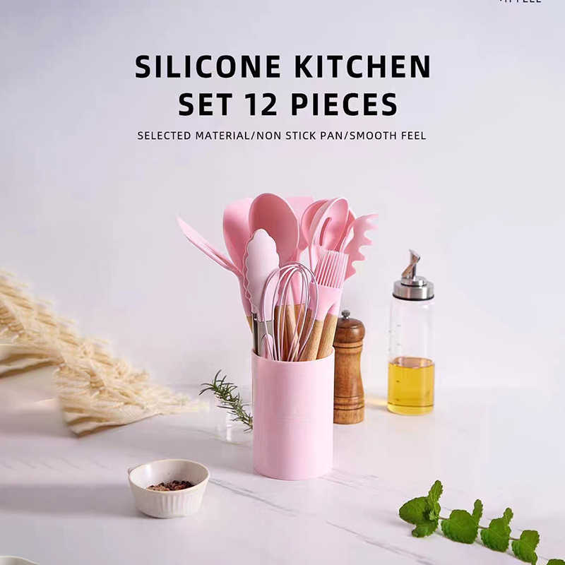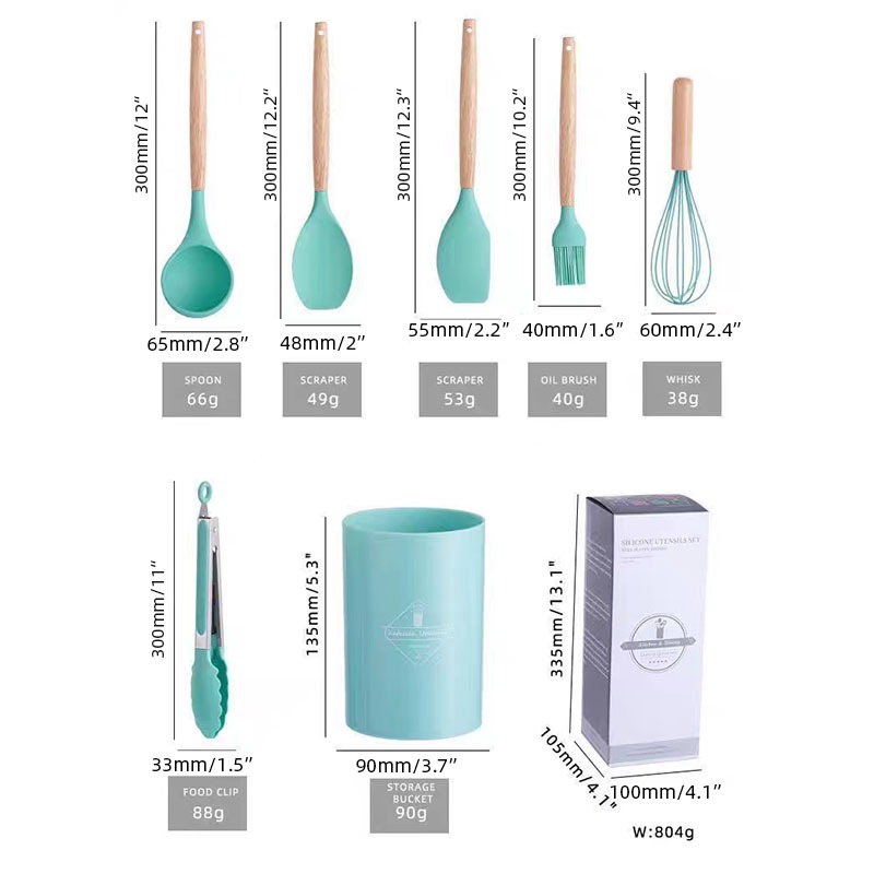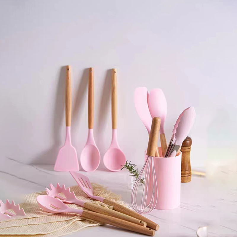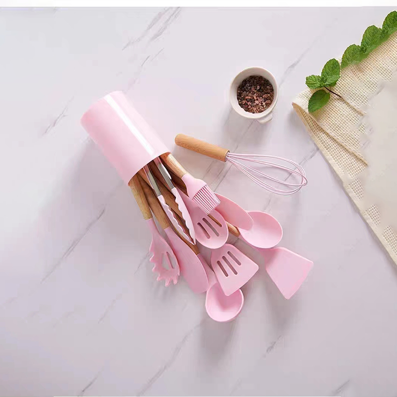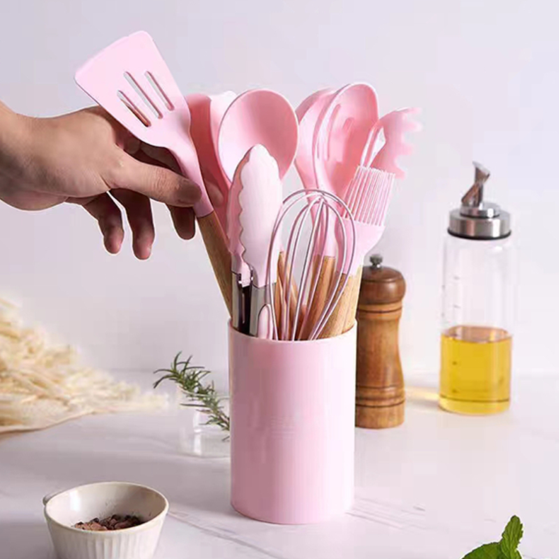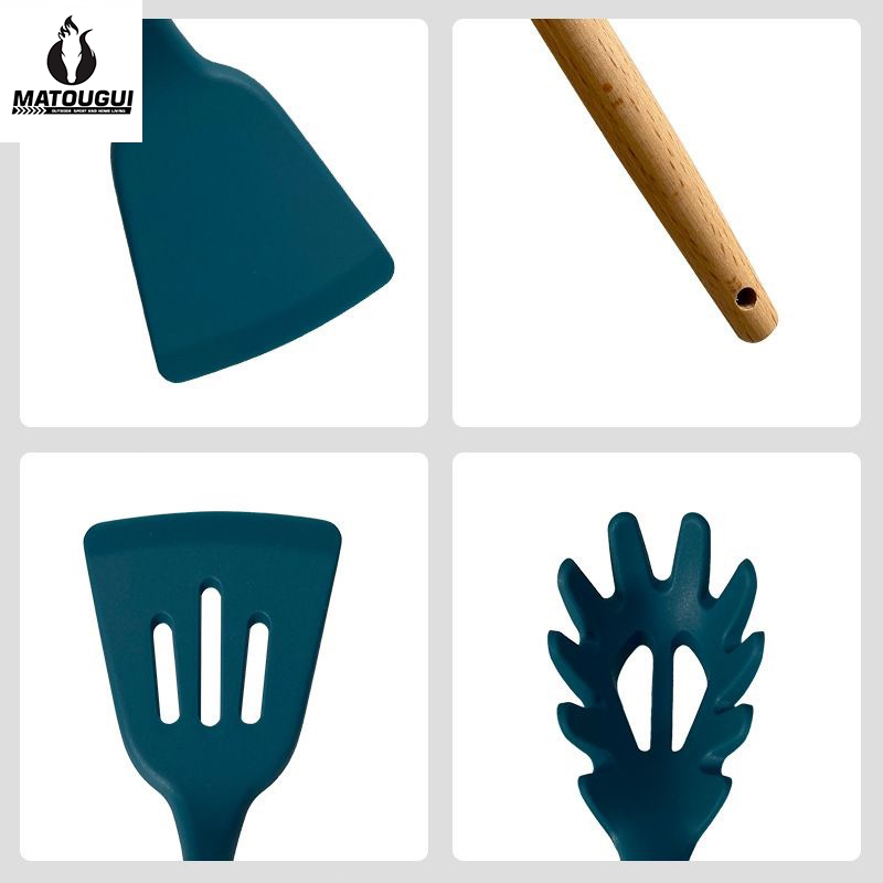 MATOUGUI 12 PCS Silicone Utensil +Wadah Spatula Peralatan Masak Sutil Pegangan Kayu Baking Set Alat Masak / Alat Masak Sehat Tahan Panas Silicone Kitchen tools Set Spatula Silikon BPA-Free