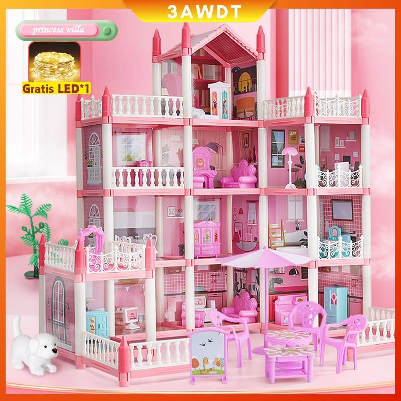 [] Mainan Anak Perempuan Rumah Boneka Besar 3D Princess Big Pink Villa DIY Doll House Lengkap Perabot Rumah dengan Lampu/Girls Makeup Toys