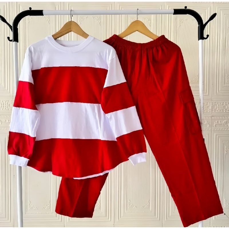 Setelan Kombinasi Merah Putih One Set Tema Kemerdekaan/ Terbaru Outfit Baju & Celana Material Crinkle Airflow/ One Set Blaster Celana Kulot Cargo Wanita