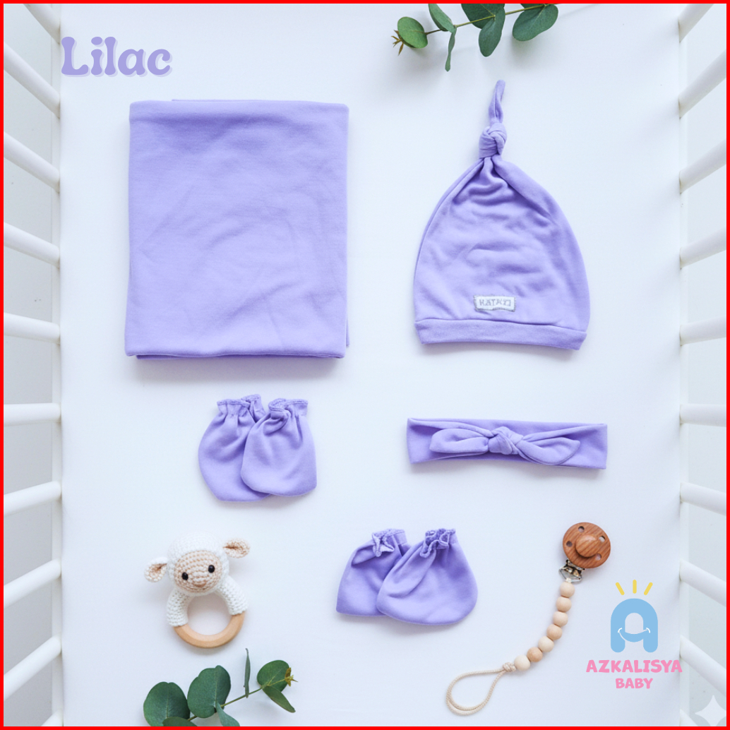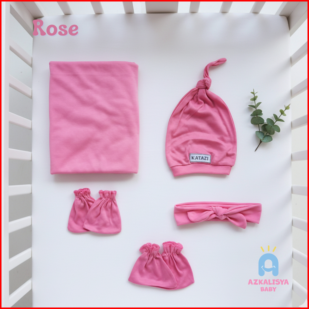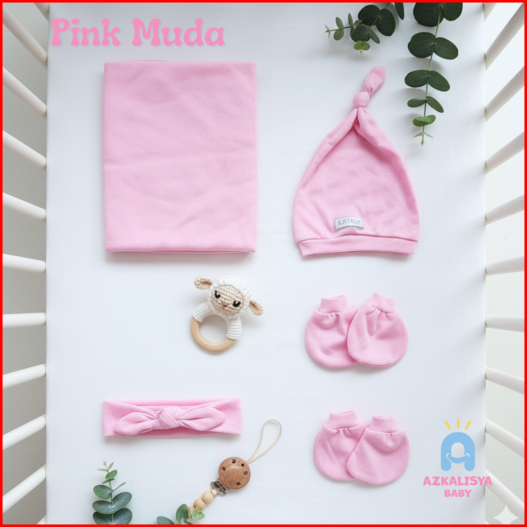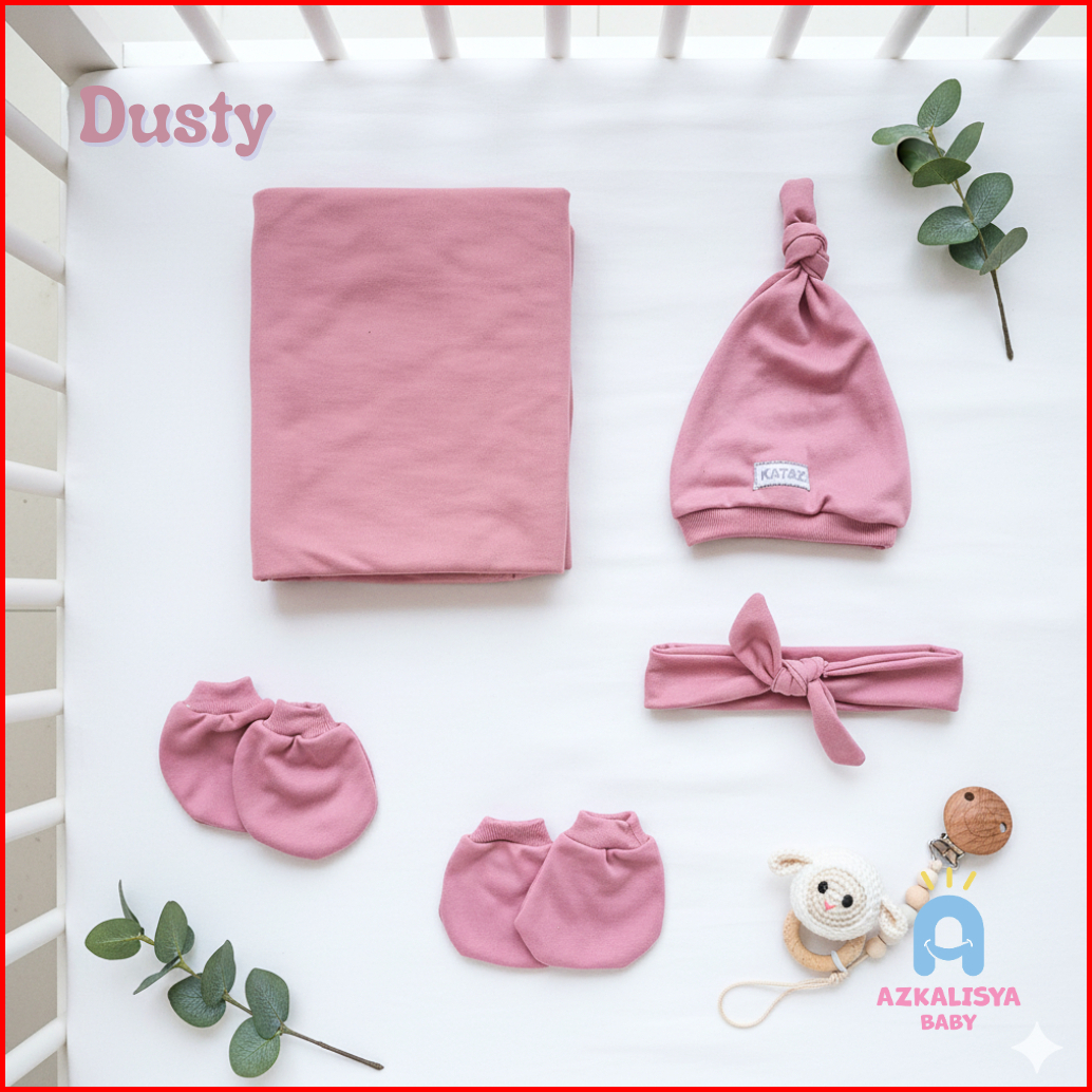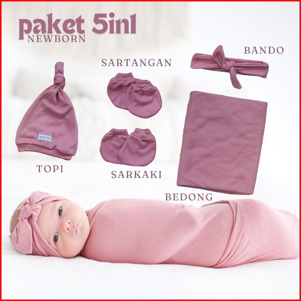 Paket Baby Newborn 5in1 Bedong Bando Topi Sarung Tangan Kaos Kaki Bayi Baru Lahir Perempuan Dusty