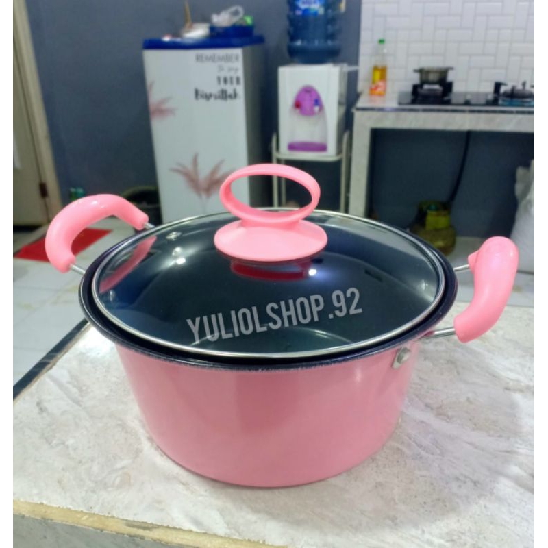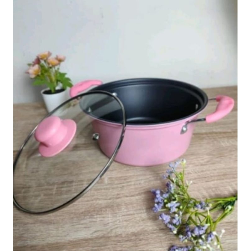 Panci Kuah Anti Lengket 20cm Tutup Kaca Pink/Hitam