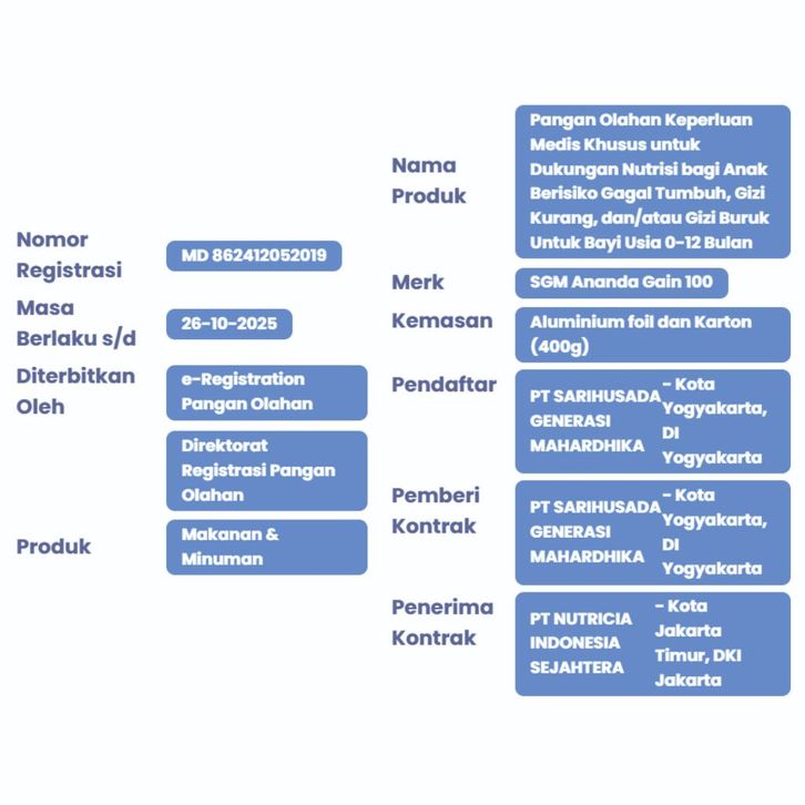 SGM Ananda Gain 100 0-12 Bulan 400 Gr - Bebas Sukrosa, Tinggi Kalori
