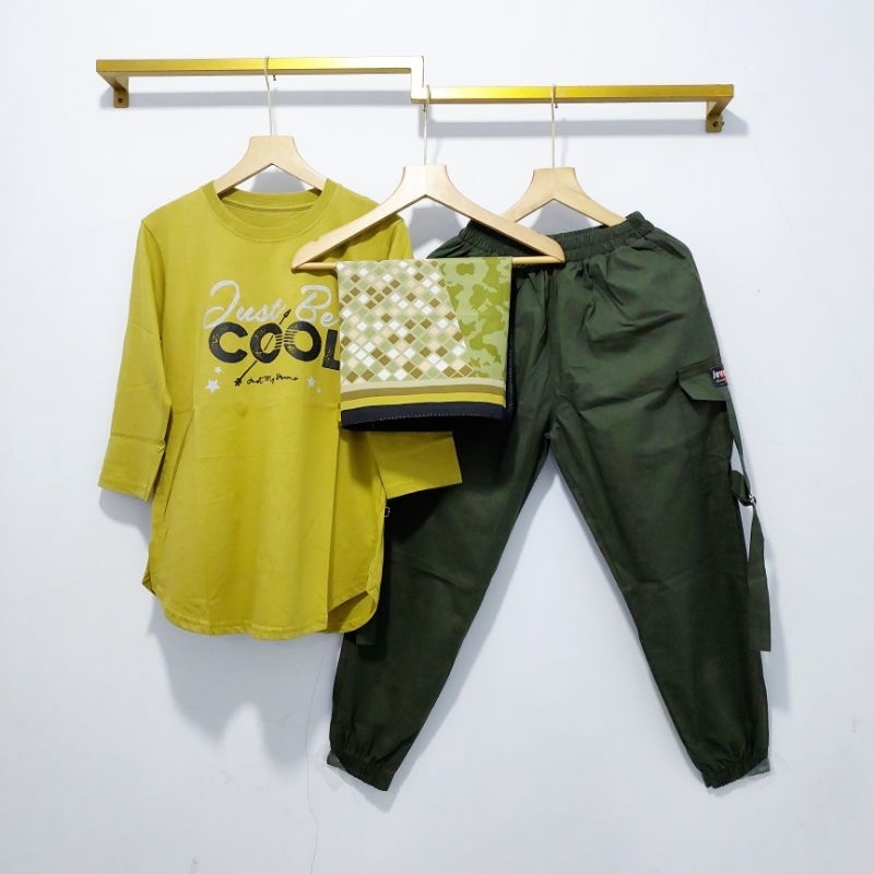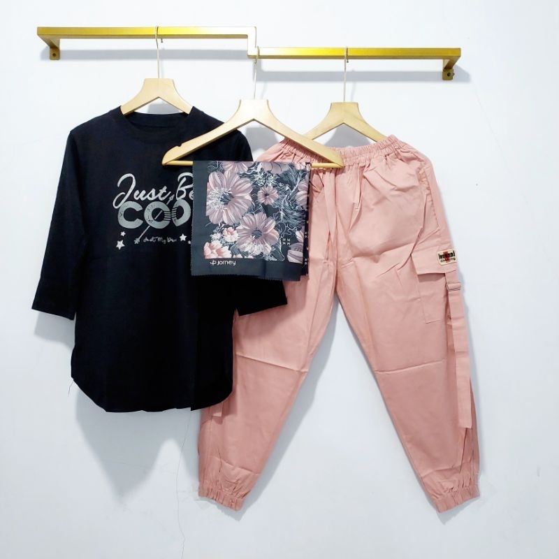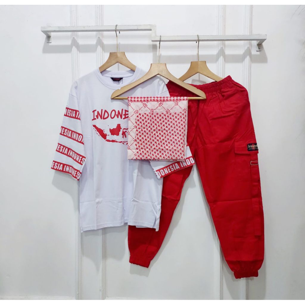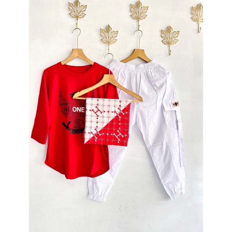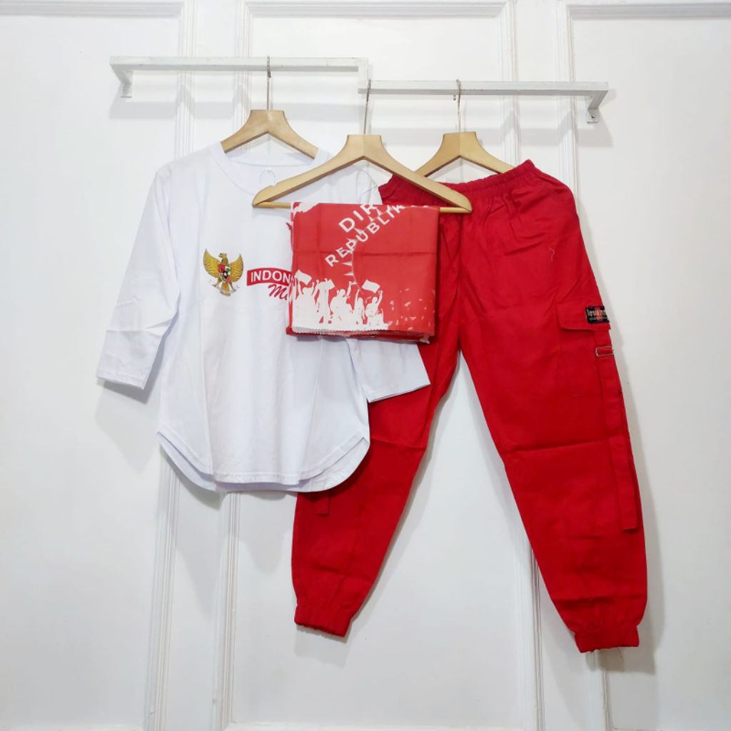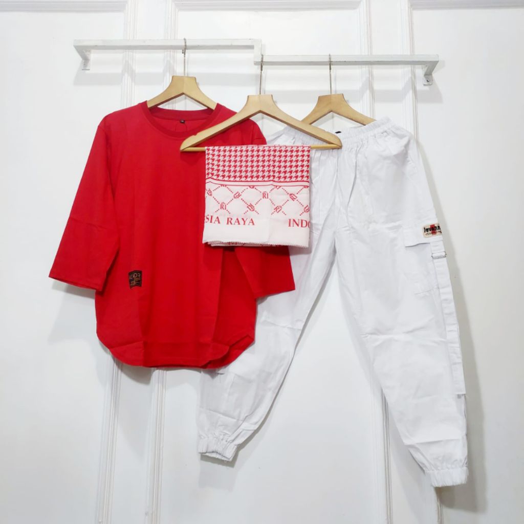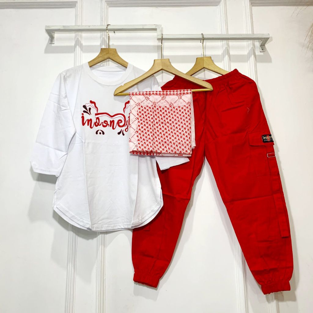Setelan Jogger Cigaret JVN Kaos Combed Merah Putih + Hijab Voal Segi Empat