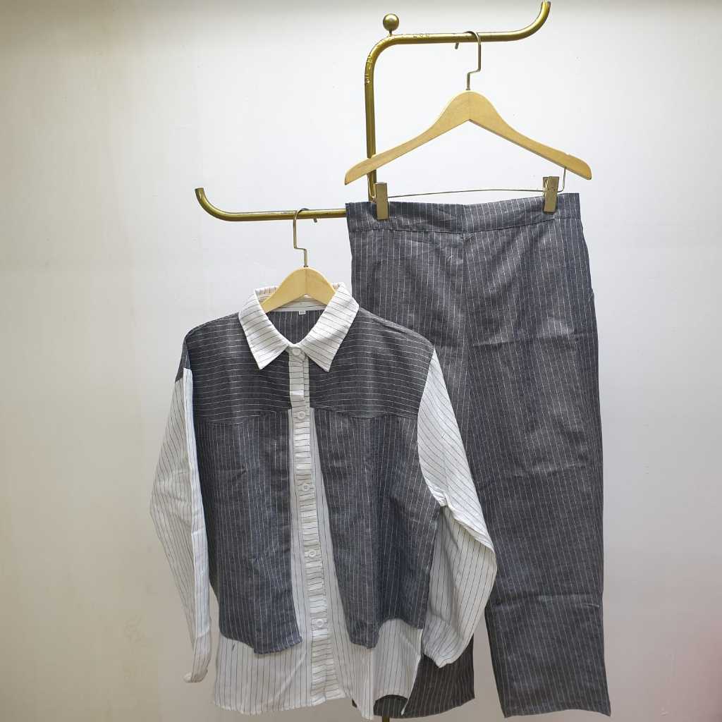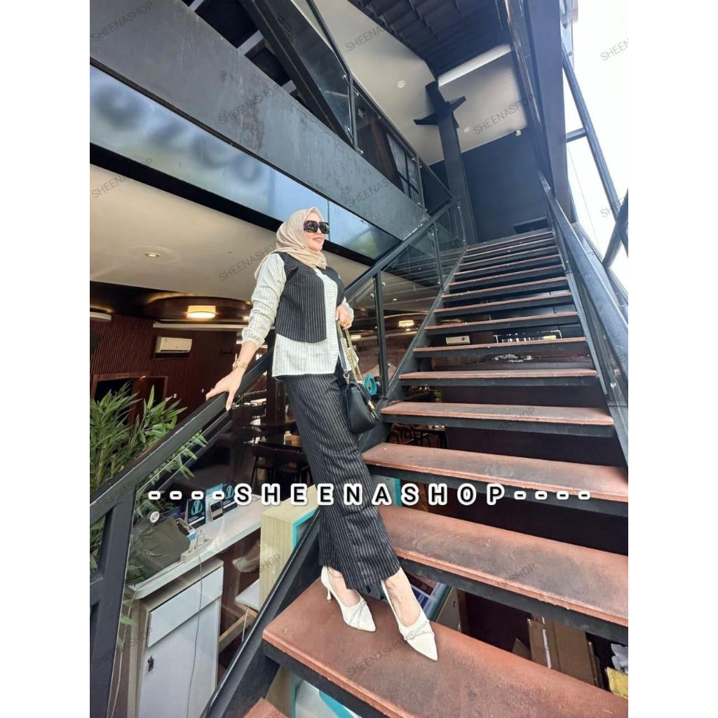 SH - One Set Celana Salur Fashion Muslim Wanita Kekinian Setelan Celana Salur Amanda