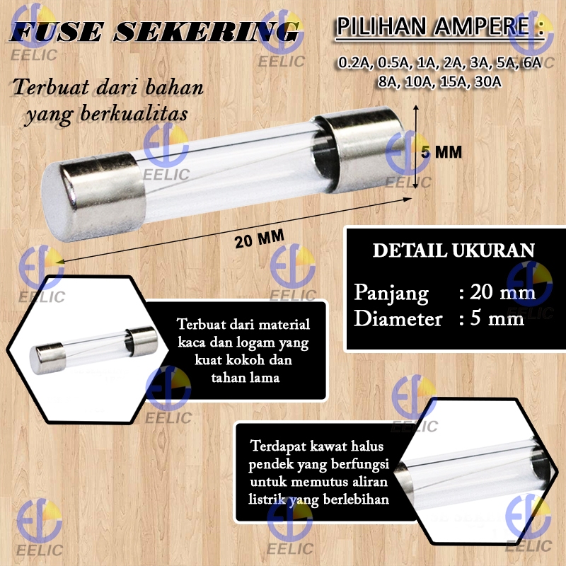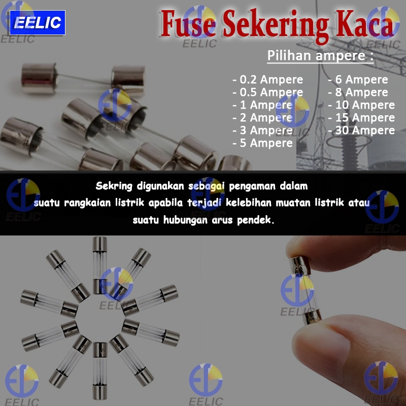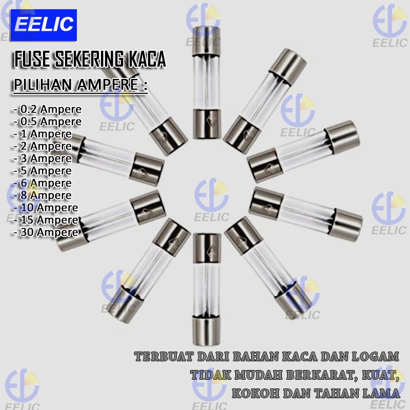 EELIC FUE-K5X20 ISI 1PCS 0.2A 0.5A 1A 2A 3A 5A 6A 8A 10A 15A 30A Fuse Sekering Berbentuk Tabung Berlapis Kaca Transparan Dan Logam Yang Berkualitas