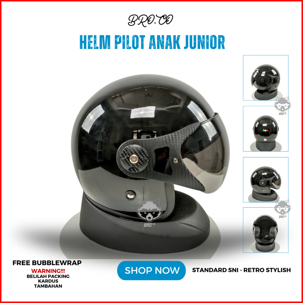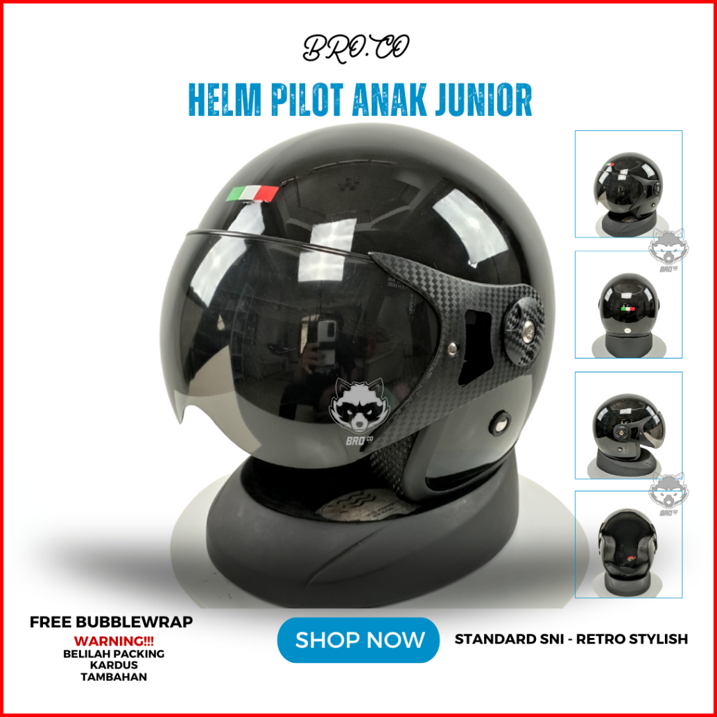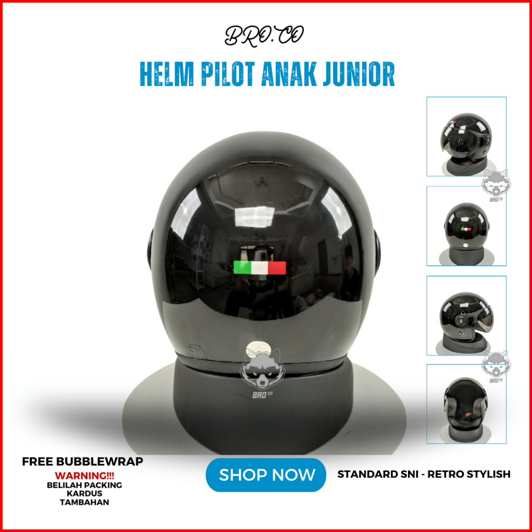 Helm Pilot Retro Italy Anak Anak Junior Half Face Hitam Black Glossy Standard Sni Premium Brokids Bro.co Untuk Laki-laki