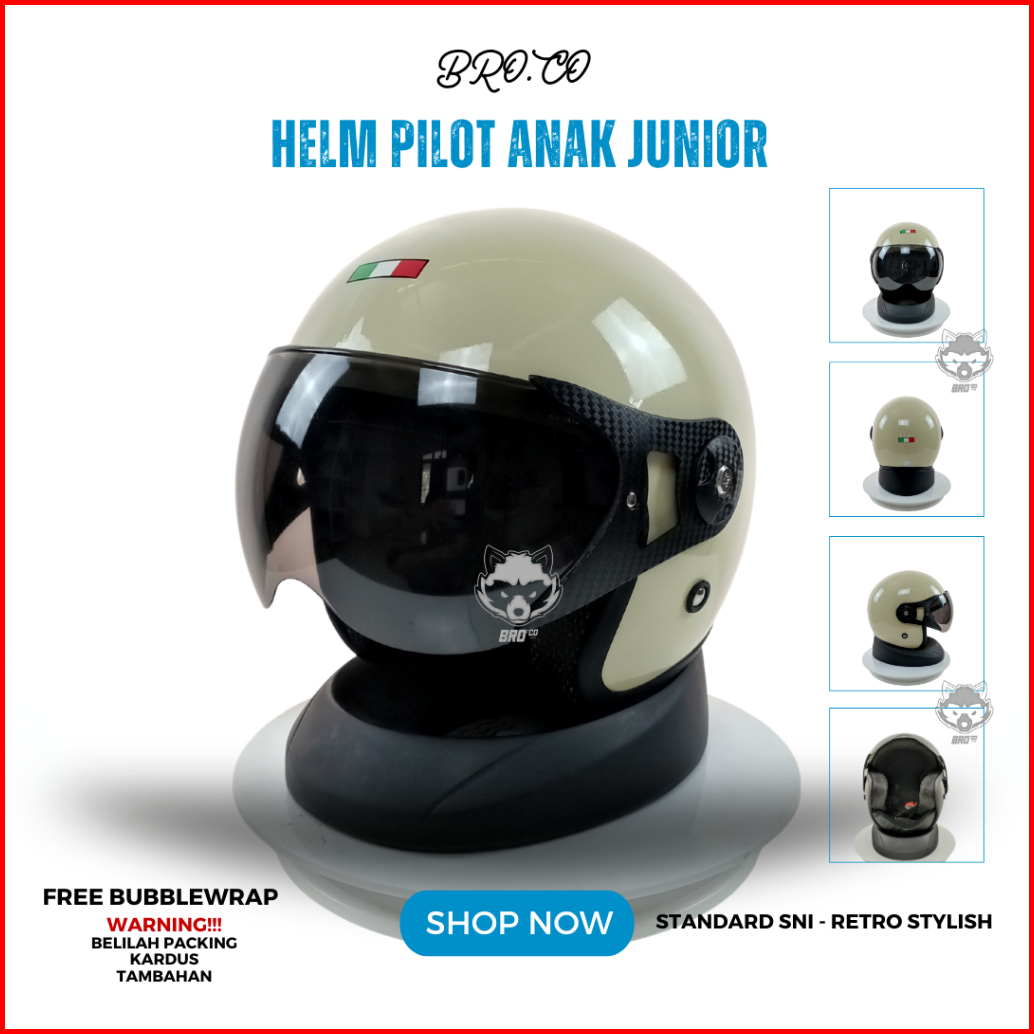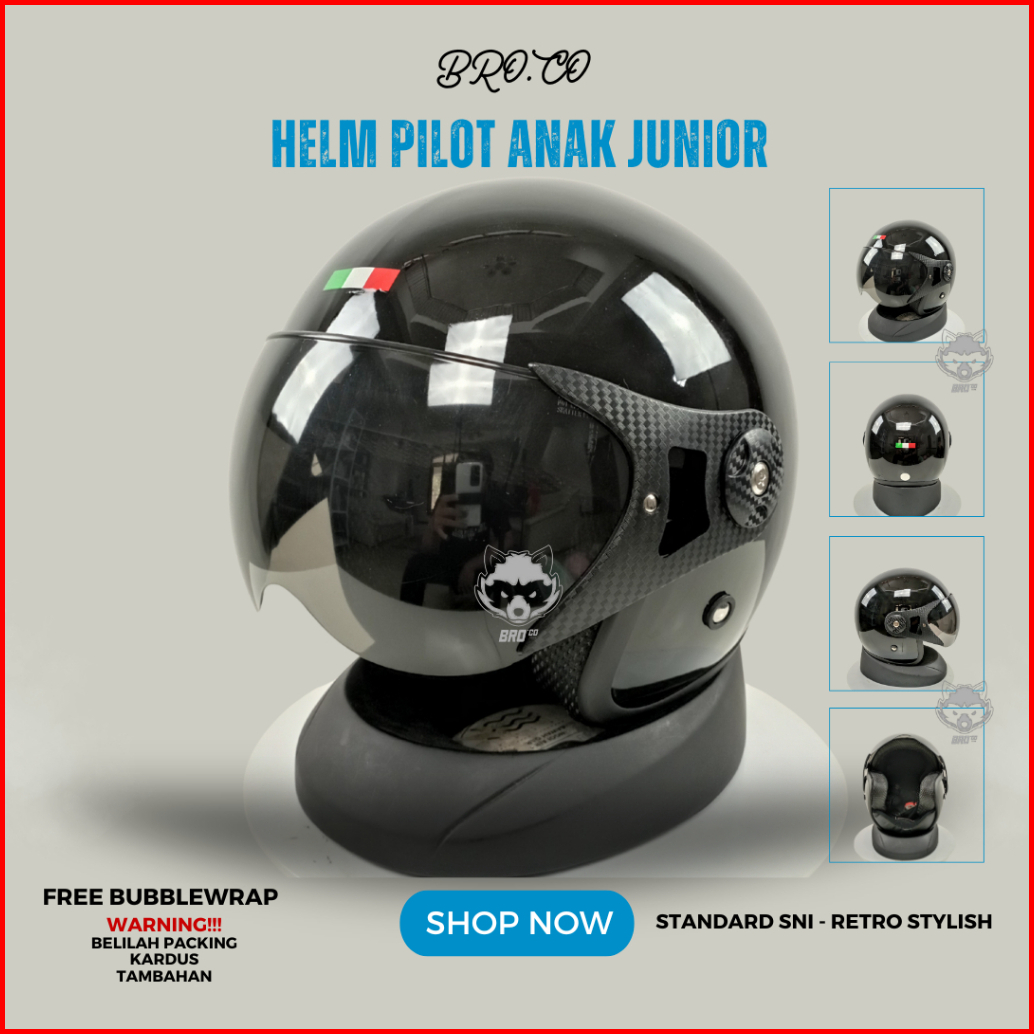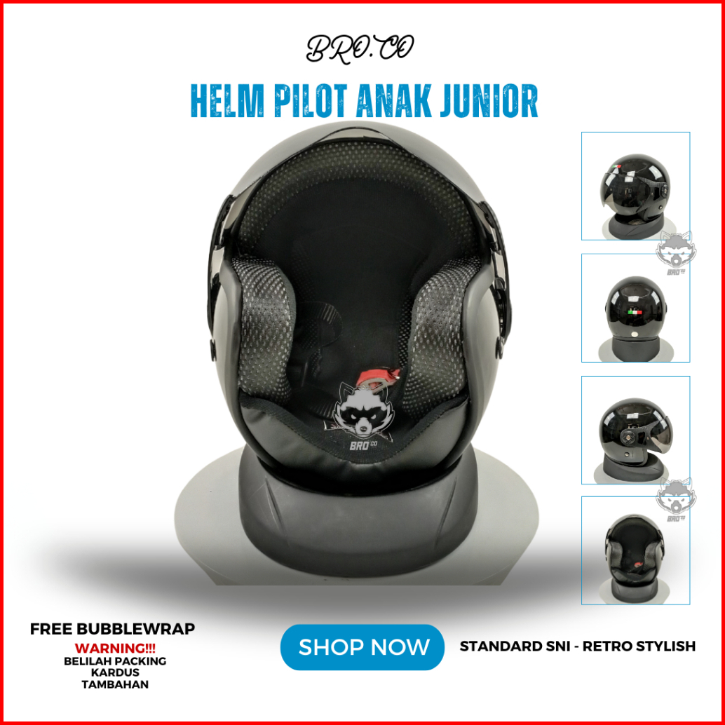 Helm Pilot Retro Italy Anak Anak Junior Half Face Hitam Black Glossy Standard Sni Premium Brokids Bro.co Untuk Laki-laki