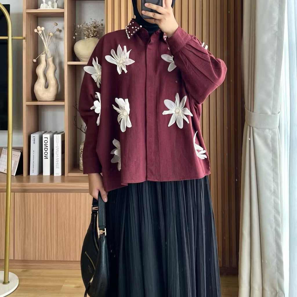 Lunara Bliss Atasan Oversize Wanita Jumbo Bahan Linen Angel Adem Tebal High Quality Bunga Lucu Simpel Busui Friendly Krah Payet Mewah Warna Hitam Navy Maroon Beige Turkish