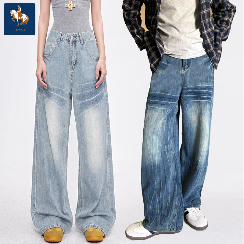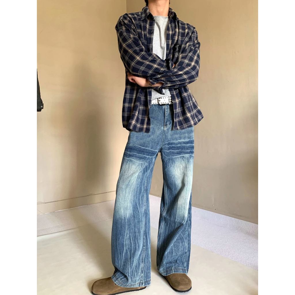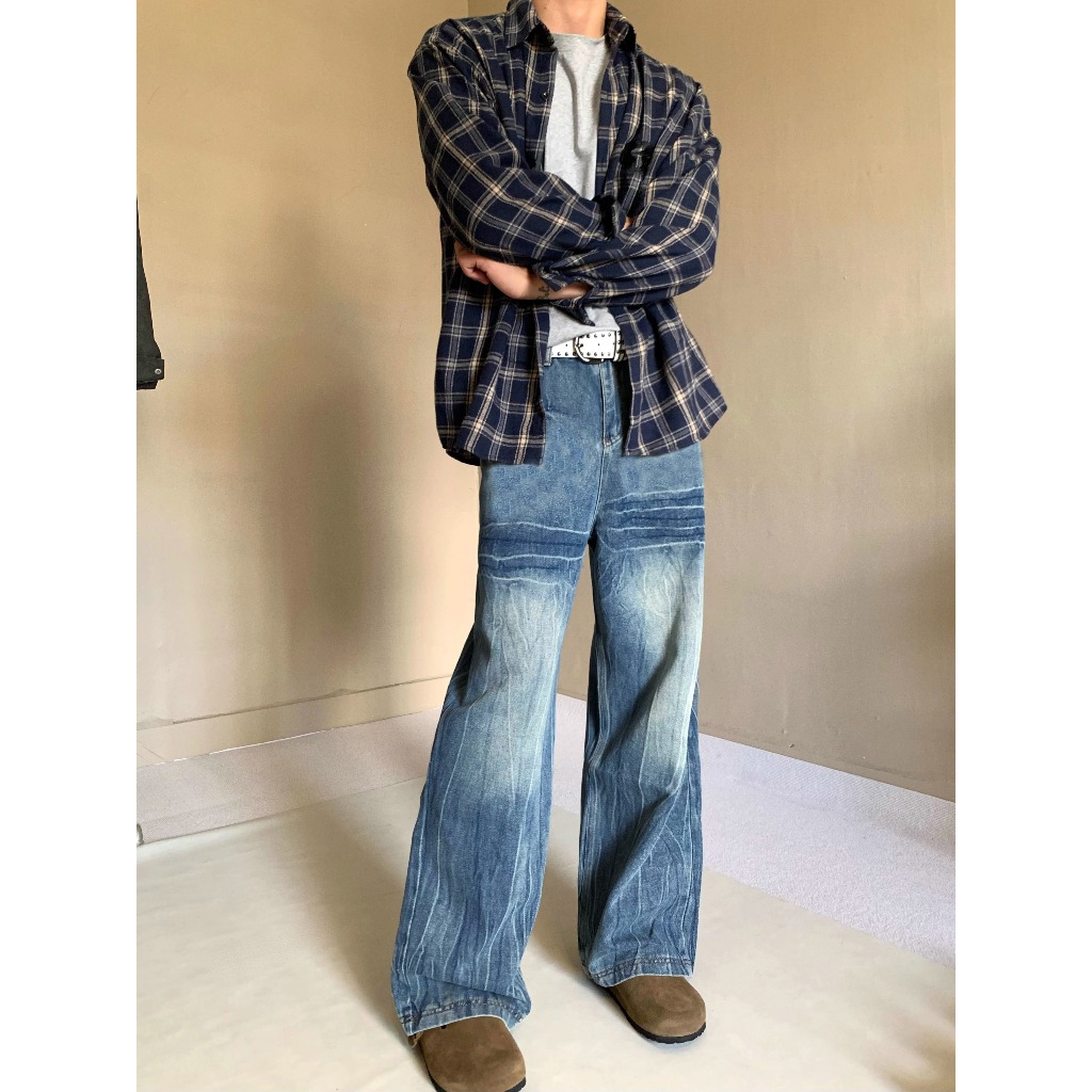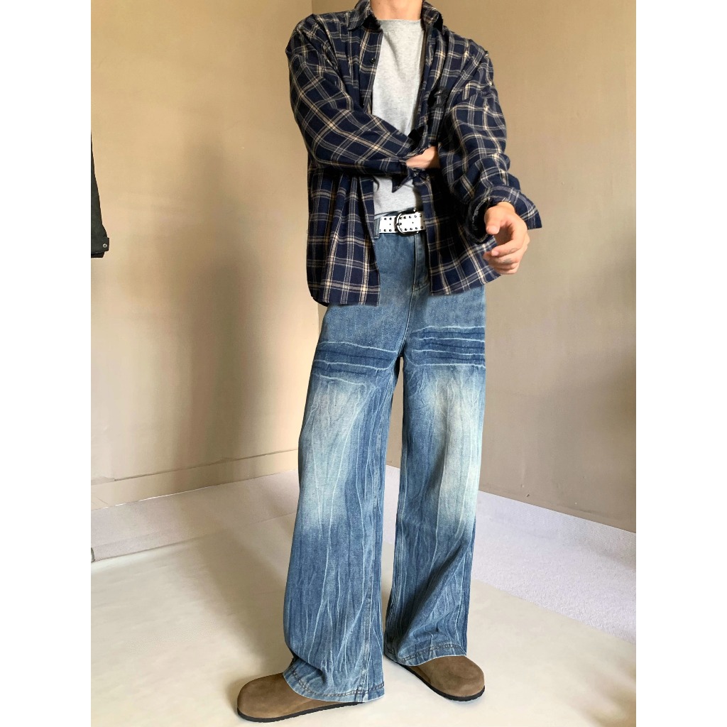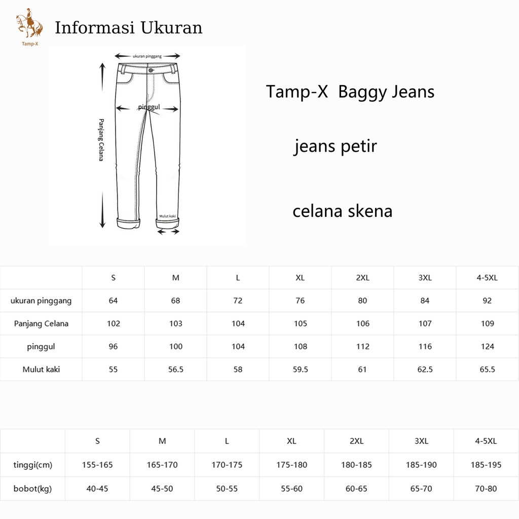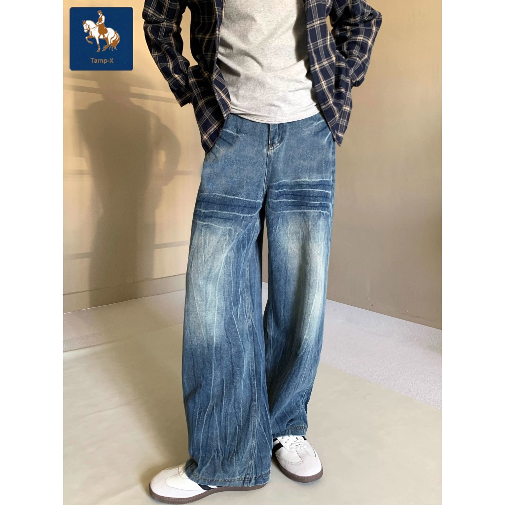 Tamp-X Oversize Baggy Celana Jeans Pria Gombrong Skena Jeans Petir Denim Jumbo Loose Jeans Korean Style Kulot Straight Retro Biru
