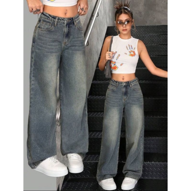 Celana Jeans Wanita High Waist Wide Leg Loose Fit Vintage Korea Streetwear Baggy Pants Kekinian