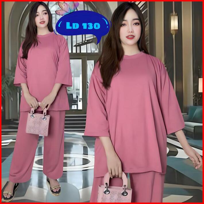 2uk Oneset Polos Jumbo Celana Atasan Oversize Basic Rata Baju Karet Wanita Setelan Kaos Melar Muslim